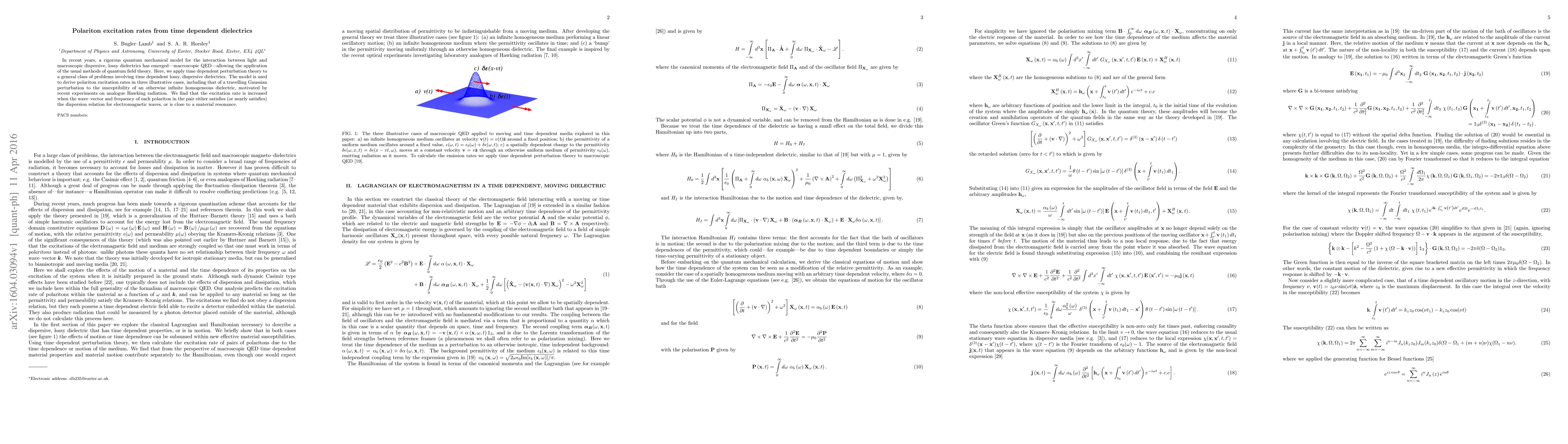 In recent years, a rigorous quantum mechanical model for the interaction between light and macroscopic dispersive, lossy dielectrics has emerged -macroscopic QED- allowing the application of the usual methods of quantum field theory. Here, we apply time dependent perturbation theory to a general class of problems involving time dependent lossy, dispersive dielectrics. The model is used to derive polariton excitation rates in three illustrative cases, including that of a travelling Gaussian perturbation to the susceptibility of an otherwise infinite homogeneous dielectric, motivated by recent experiments on analogue Hawking radiation. We find that the excitation rate is increased when the wave--vector and frequency of each polariton in the pair either satisfies (or nearly satisfies) the dispersion relation for electromagnetic waves, or is close to a material resonance.