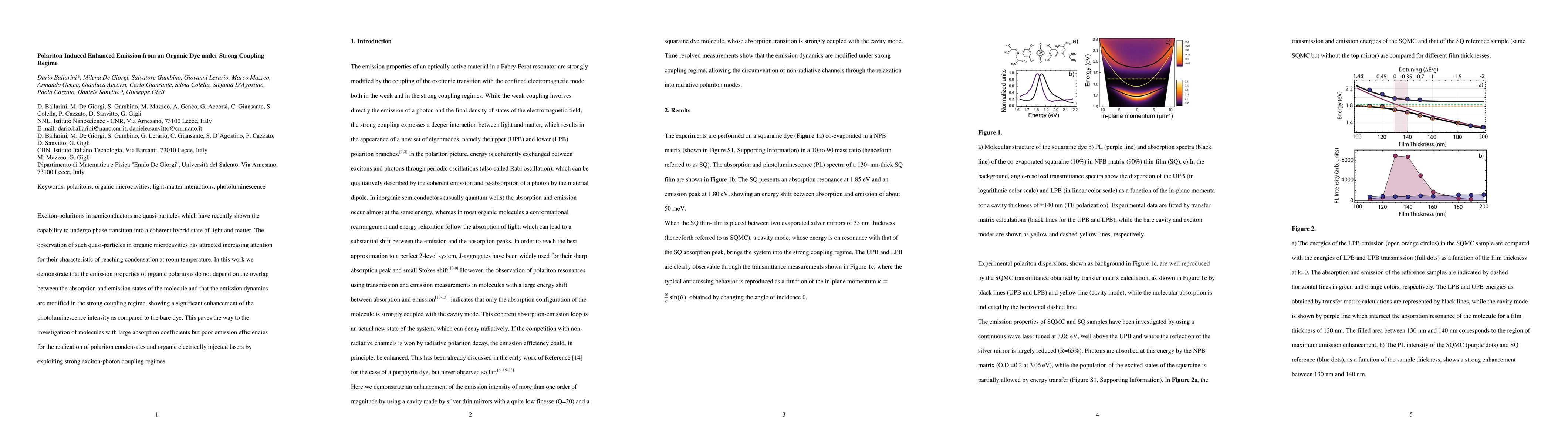 This paper demonstrates that organic dye emission in a strong coupling regime with exciton-polaritons significantly enhances photoluminescence intensity, independent of the molecule's absorption and emission state overlap. This discovery opens pathways for utilizing materials with high absorption but low emission efficiency in polariton condensates and organic lasers.