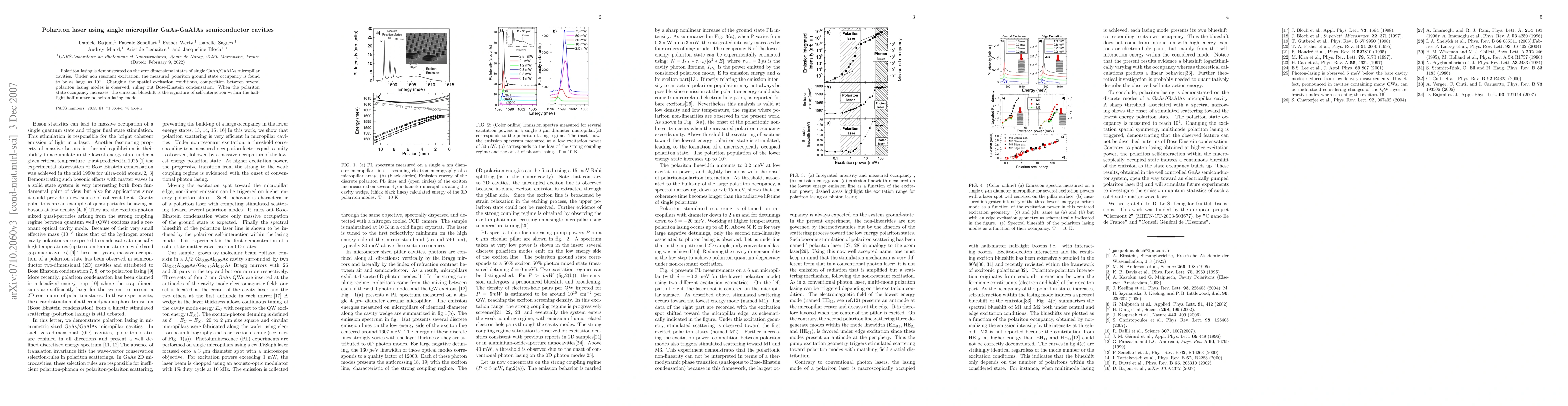 This paper demonstrates polariton lasing in single micropillar GaAs-GaAlAs semiconductor cavities, showing high polariton ground state occupancy and observing competition between lasing modes, which rules out Bose-Einstein condensation. The emission blueshift indicates self-interaction within the polariton mode.