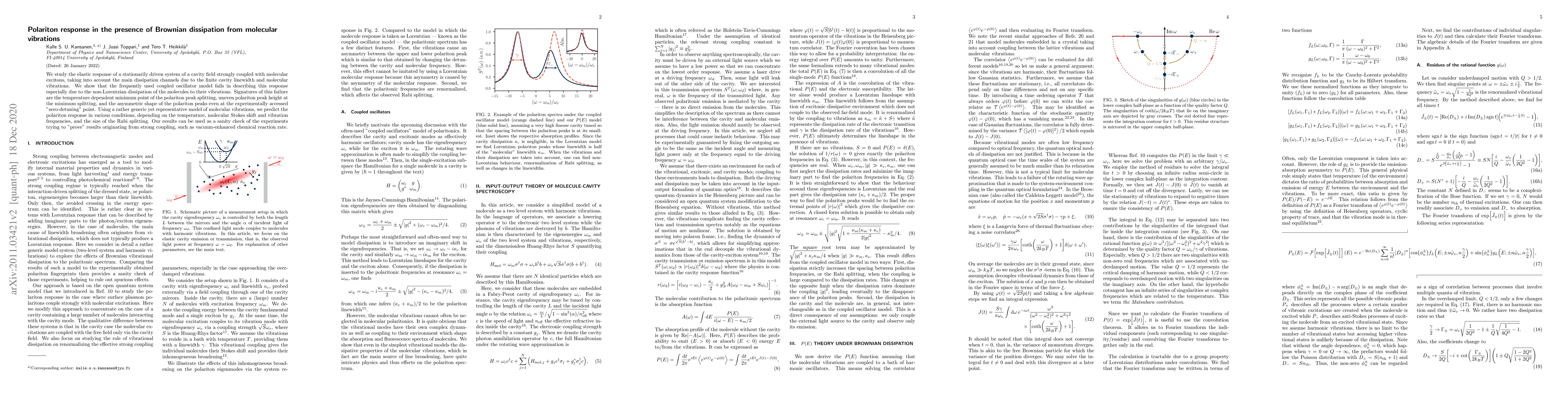 This paper investigates the elastic response of a cavity field strongly coupled with molecular excitons, highlighting the failure of the coupled oscillator model due to non-Lorentzian dissipation from molecular vibrations. It predicts the polariton response's dependence on temperature, molecular Stokes shift, vibration frequencies, and Rabi splitting, providing insights for validating strong coupling experiments.