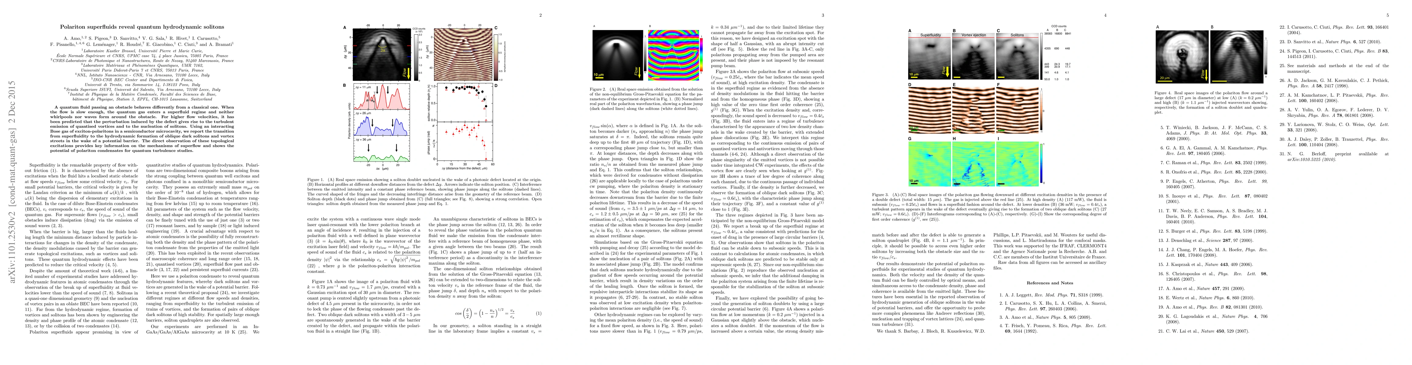 A quantum fluid passing an obstacle behaves differently from a classical one. When the flow is slow enough, the quantum gas enters a superfluid regime and neither whirlpools nor waves form around the obstacle. For higher flow velocities, it has been predicted that the perturbation induced by the defect gives rise to the turbulent emission of quantised vortices and to the nucleation of solitons. Using an interacting Bose gas of exciton-polaritons in a semiconductor microcavity, we report the transition from superfluidity to the hydrodynamic formation of oblique dark solitons and vortex streets in the wake of a potential barrier. The direct observation of these topological excitations provides key information on the mechanisms of superflow and shows the potential of polariton condensates for quantum turbulence studies.