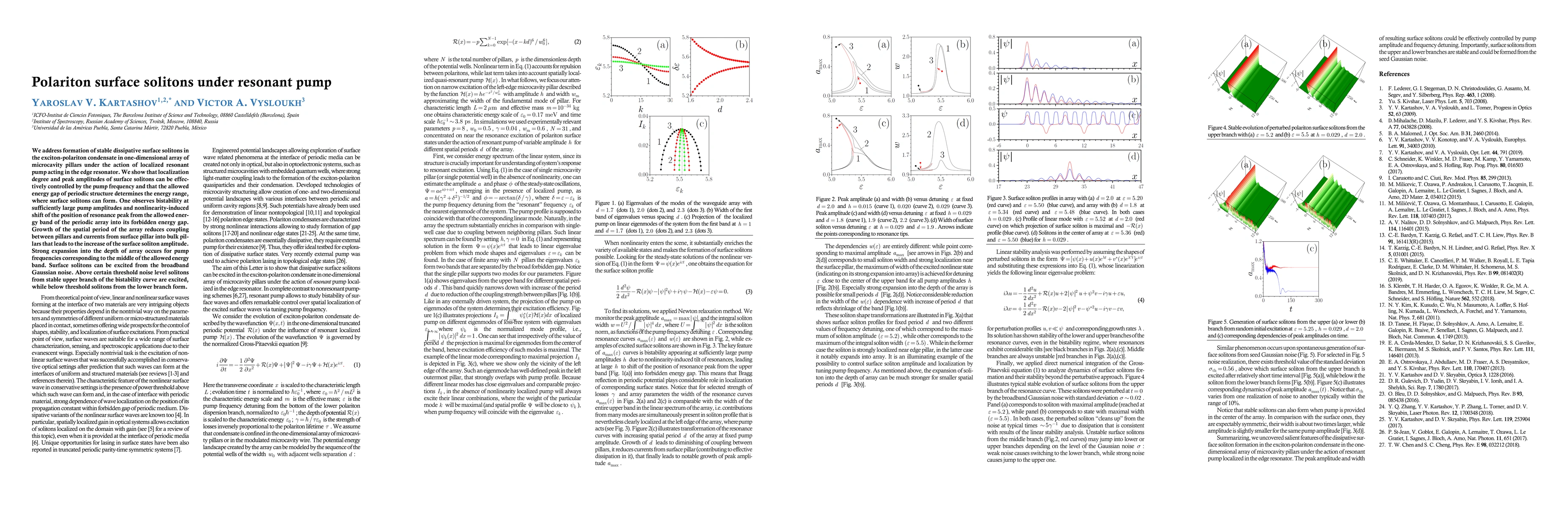 This paper investigates the formation and control of stable dissipative surface solitons in exciton-polariton condensates under a resonant pump in a one-dimensional microcavity array, demonstrating that soliton properties are tunable by pump frequency and the energy gap of the structure. The study reveals bistability, nonlinearity-induced resonance shifts, and soliton excitation from noise, highlighting the impact of spatial period growth on soliton amplitude and behavior.