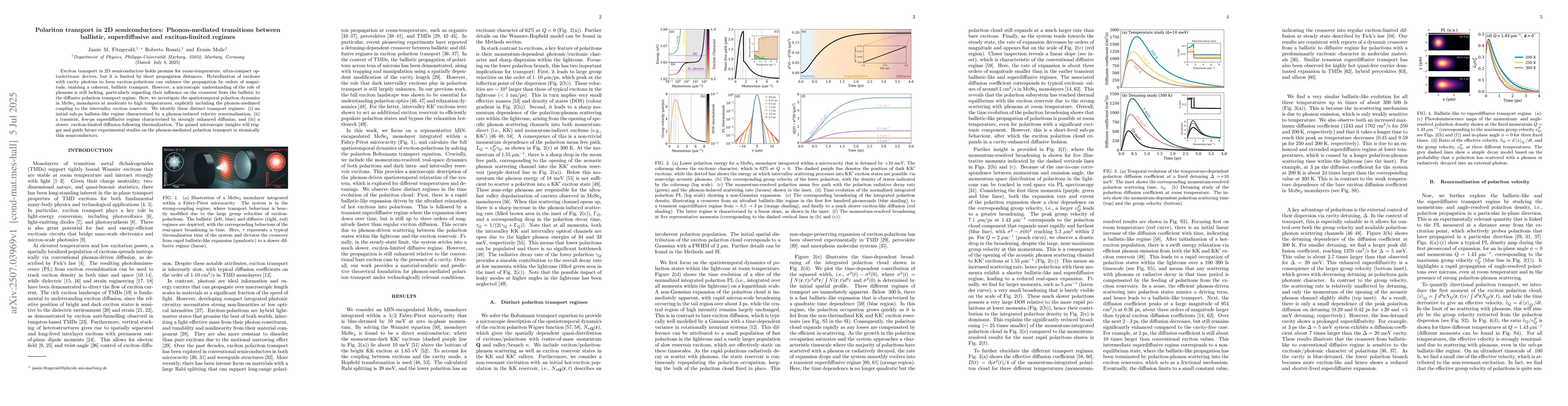 This research distinguishes itself by providing a detailed microscopic understanding of phonon-mediated transitions between ballistic, superdiffusive, and exciton-limited polariton transport regimes in 2D semiconductors.