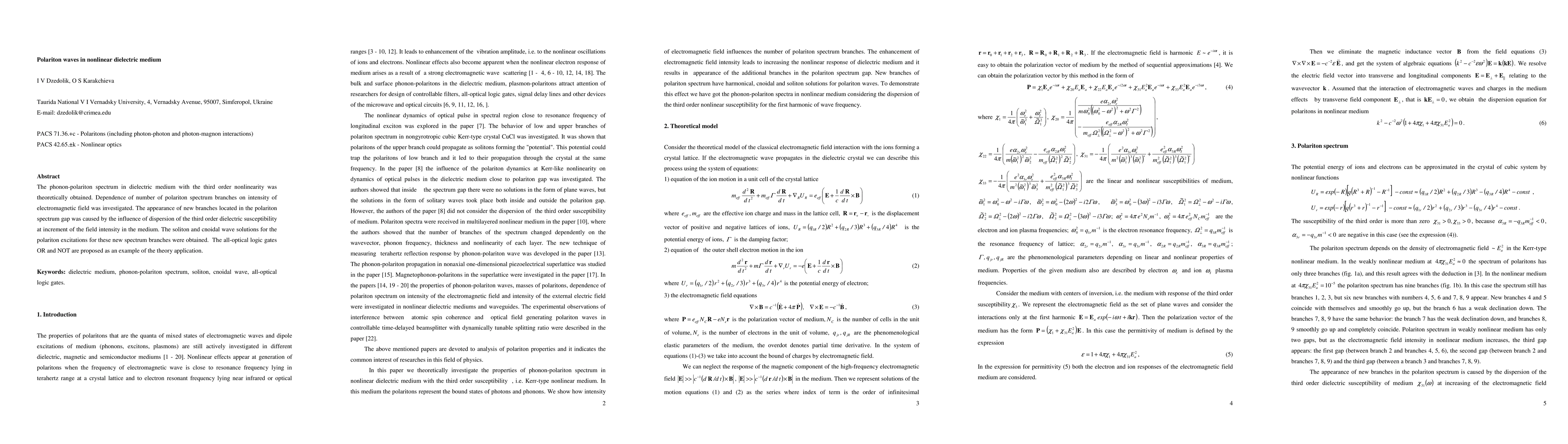 This paper theoretically investigates phonon-polariton spectra in nonlinear dielectric media, revealing new branches due to third-order nonlinearity and field intensity. It proposes soliton and cnoidal wave solutions for these excitations and suggests applications in all-optical logic gates.