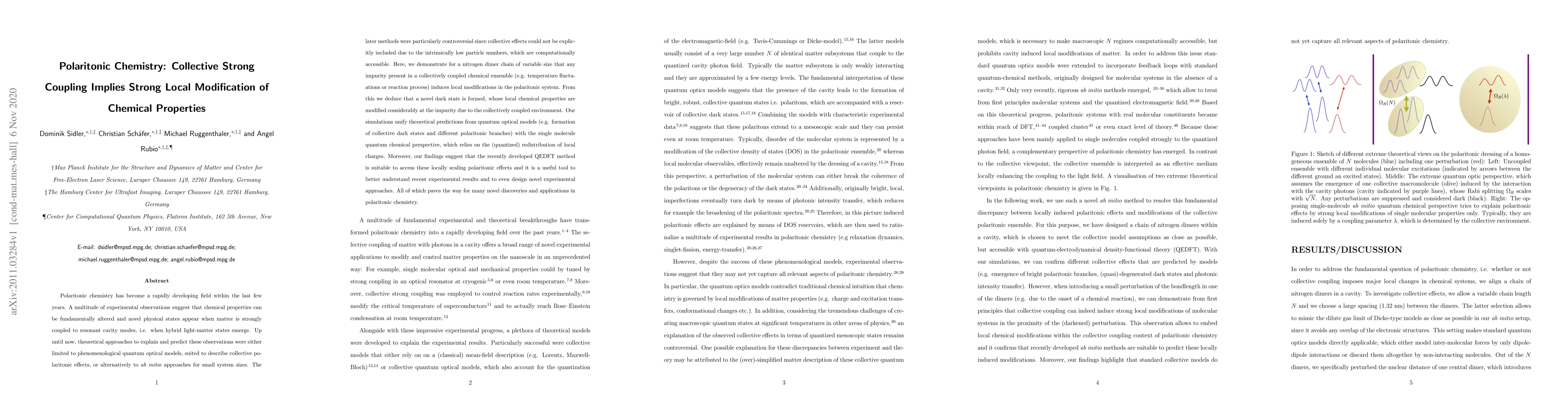 Polaritonic chemistry has become a rapidly developing field within the last few years. A multitude of experimental observations suggest that chemical properties can be fundamentally altered and novel physical states appear when matter is strongly coupled to resonant cavity modes, i.e. when hybrid light-matter states emerge. Up until now, theoretical approaches to explain and predict these observations were either limited to phenomenological quantum optical models, suited to describe collective polaritonic effects, or alternatively to ab initio approaches for small system sizes. The later methods were particularly controversial since collective effects could not be explicitly included due to the intrinsically low particle numbers, which are computationally accessible. Here, we demonstrate for a nitrogen dimer chain of variable size that any impurity present in a collectively coupled chemical ensemble (e.g. temperature fluctuations or reaction process) induces local modifications in the polaritonic system. From this we deduce that a novel dark state is formed, whose local chemical properties are modified considerably at the impurity due to the collectively coupled environment. Our simulations unify theoretical predictions from quantum optical models (e.g. formation of collective dark states and different polaritonic branches) with the single molecule quantum chemical perspective, which relies on the (quantized) redistribution of local charges. Moreover, our findings suggest that the recently developed QEDFT method is suitable to access these locally scaling polaritonic effects and it is a useful tool to better understand recent experimental results and to even design novel experimental approaches. All of which paves the way for many novel discoveries and applications in polaritonic chemistry.