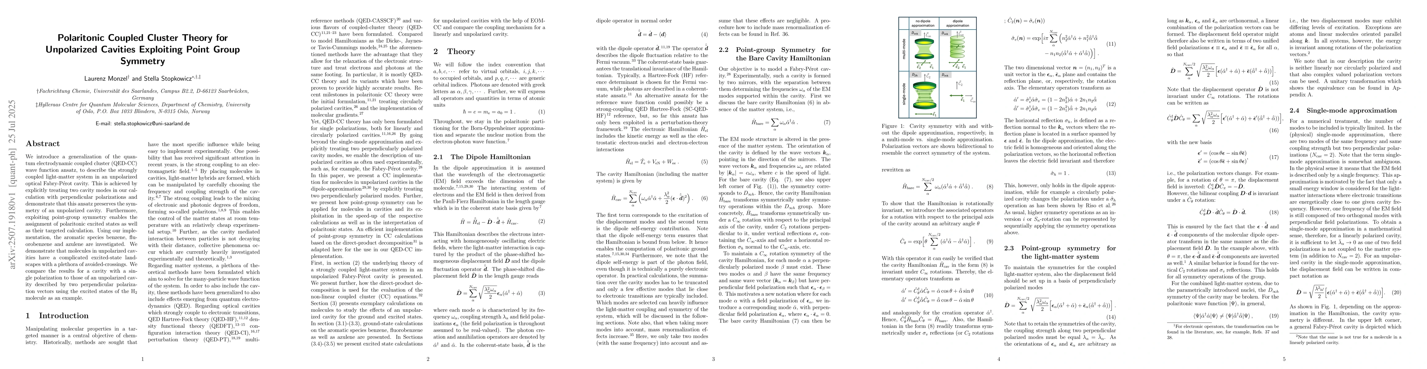 We introduce a generalization of the quantum electrodynamic coupled cluster (QED-CC)wave function ansatz, to describe the strongly coupled light-matter system in an unpolarized optical Fabry-P\'erot cavity. This is achieved by explicitly treating two cavity modes in our calculation with perpendicular polarizations and demonstrate that this ansatz preserves the symmetry of an unpolarized cavity. Furthermore, exploiting point-group symmetry enables the assignment of polaritonic excited states as well as their targeted calculation. Using our implementation, the aromatic species benzene, fluorobenzene and azulene are investigated. We demonstrate that molecules in unpolarized cavities have a complicated excited-state landscapes with a plethora of avoided-crossings. We compare the results for a cavity with a single polarization to those of an unpolarized cavity described by two perpendicular polarization vectors using the excited states of the H$_2$ molecule as an example.