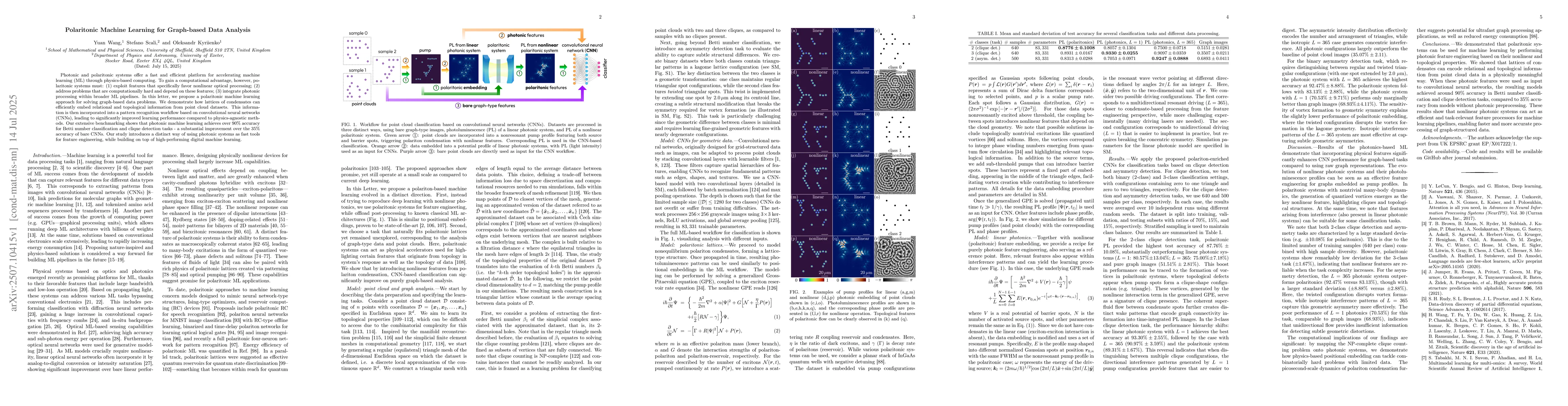 Photonic and polaritonic systems offer a fast and efficient platform for accelerating machine learning (ML) through physics-based computing. To gain a computational advantage, however, polaritonic systems must: (1) exploit features that specifically favor nonlinear optical processing; (2) address problems that are computationally hard and depend on these features; (3) integrate photonic processing within broader ML pipelines. In this letter, we propose a polaritonic machine learning approach for solving graph-based data problems. We demonstrate how lattices of condensates can efficiently embed relational and topological information from point cloud datasets. This information is then incorporated into a pattern recognition workflow based on convolutional neural networks (CNNs), leading to significantly improved learning performance compared to physics-agnostic methods. Our extensive benchmarking shows that photonic machine learning achieves over 90\% accuracy for Betti number classification and clique detection tasks - a substantial improvement over the 35\% accuracy of bare CNNs. Our study introduces a distinct way of using photonic systems as fast tools for feature engineering, while building on top of high-performing digital machine learning.