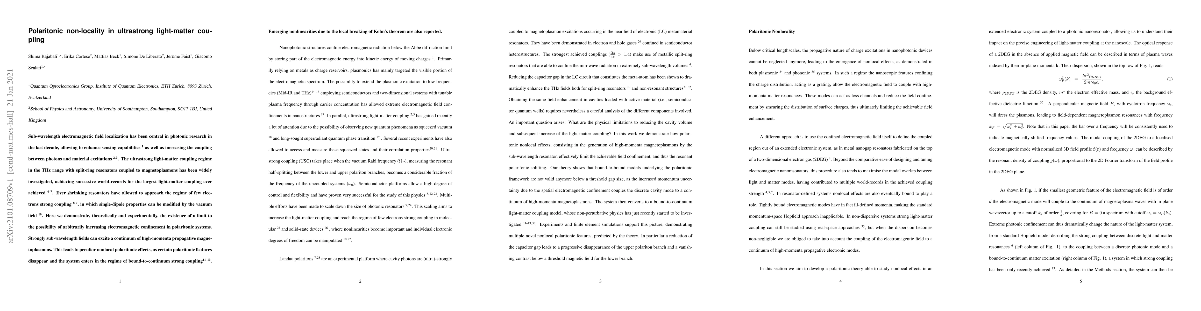 Sub-wavelength electromagnetic field localization has been central in photonic research in the last decade, allowing to enhance sensing capabilities as well as increasing the coupling between photons and material excitations. The ultrastrong light-matter coupling regime in the THz range with split-ring resonators coupled to magnetoplasmons has been widely investigated, achieving successive world-records for the largest light-matter coupling ever achieved. Ever shrinking resonators have allowed to approach the regime of few electrons strong coupling, in which single-dipole properties can be modified by the vacuum field. Here we demonstrate, theoretically and experimentally, the existence of a limit to the possibility of arbitrarily increasing electromagnetic confinement in polaritonic systems. Strongly sub-wavelength fields can excite a continuum of high-momenta propagative magnetoplasmons. This leads to peculiar nonlocal polaritonic effects, as certain polaritonic features disappear and the system enters in the regime of bound-to-continuum strong coupling. Emerging nonlinearities due to the local breaking of Kohn's theorem are also reported.