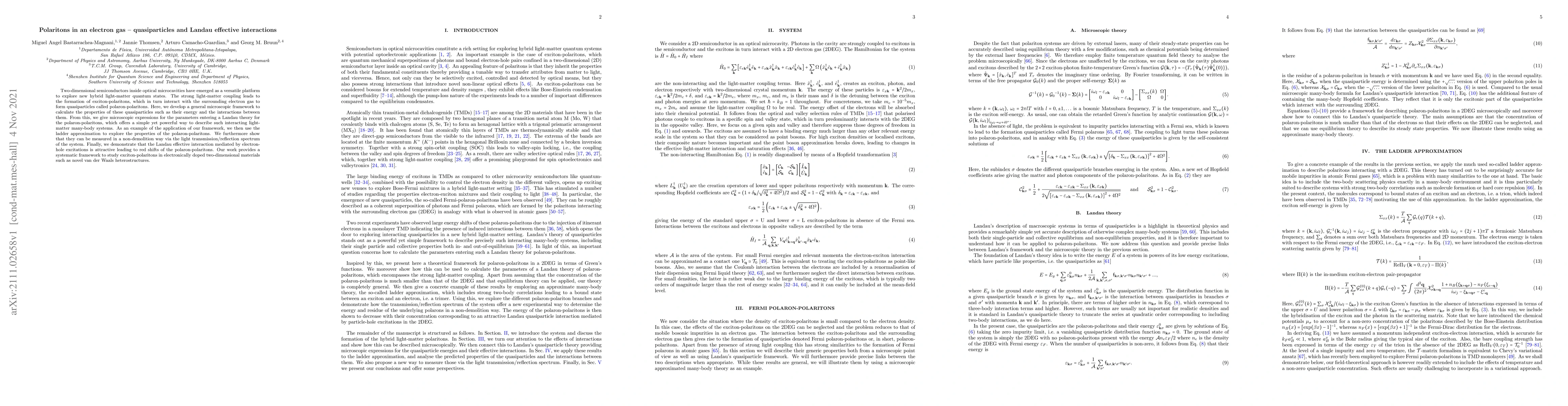 Two-dimensional semiconductors inside optical microcavities have emerged as a versatile platform to explore new hybrid light-matter quantum states. The strong light-matter coupling leads to the formation of exciton-polaritons, which in turn interact with the surrounding electron gas to form quasiparticles called polaron-polaritons. Here, we develop a general microscopic framework to calculate the properties of these quasiparticles such as their energy and the interactions between them. From this, we give microscopic expressions for the parameters entering a Landau theory for the polaron-polaritons, which offers a simple yet powerful way to describe such interacting light-matter many-body systems. As an example of the application of our framework, we then use the ladder approximation to explore the properties of the polaron-polaritons. We furthermore show that they can be measured in a non-demolition way via the light transmission/reflection spectrum of the system. Finally, we demonstrate that the Landau effective interaction mediated by electron-hole excitation is attractive leading to red shifts of the polaron-polaritons. Our work provides a systematic framework to study exciton-polaritons in electronically doped two-dimensional materials such as novel van der Waals heterostructures.
