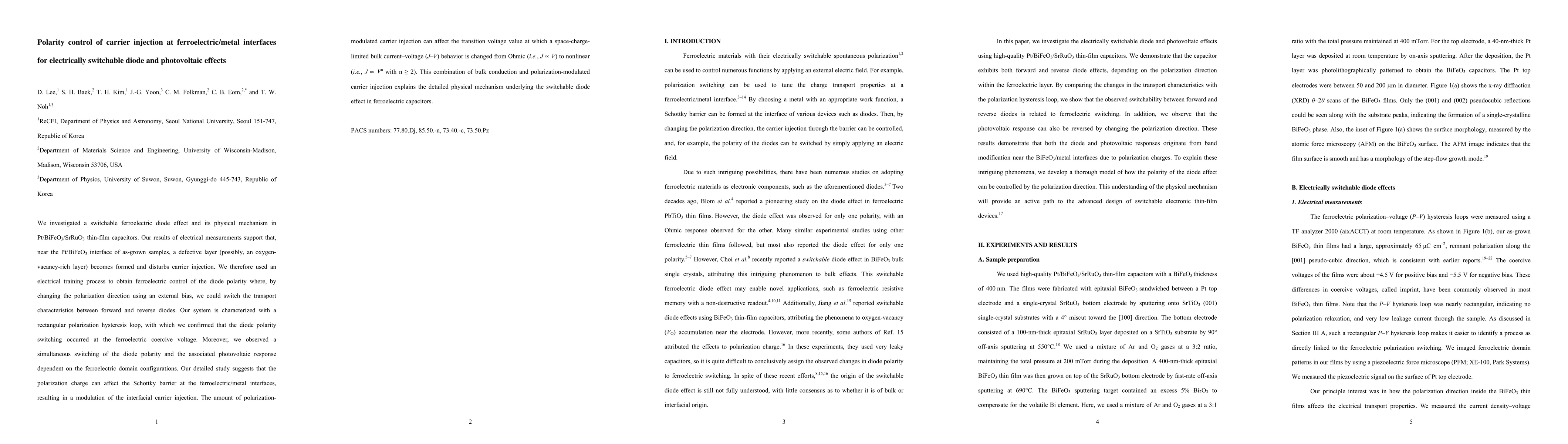 This study explores ferroelectric control of diode polarity in Pt/BiFeO3/SrRuO3 thin-film capacitors, demonstrating that an oxygen-vacancy-rich layer near the Pt/BiFeO3 interface disrupts carrier injection. By applying an electrical training process, the researchers achieved ferroelectric-controlled diode polarity switching, revealing a photovoltaic response tied to ferroelectric domain configurations.