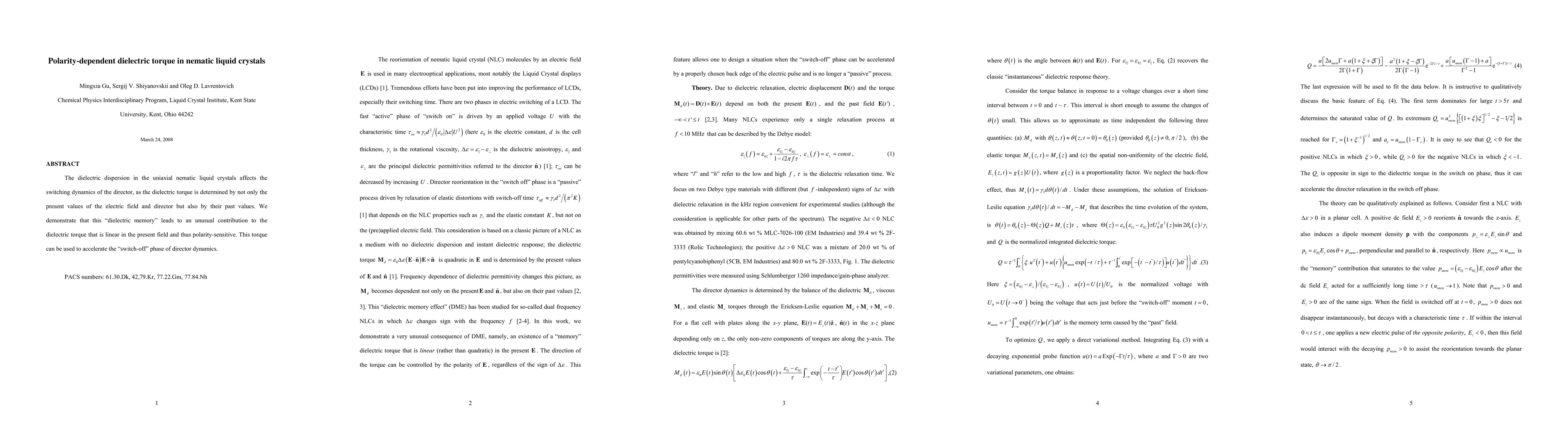 The dielectric dispersion in the uniaxial nematic liquid crystals affects the switching dynamics of the director, as the dielectric torque is determined by not only the present values of the electric field and director but also by their past values. We demonstrate that this dielectric memory leads to an unusual contribution to the dielectric torque that is linear in the present field and thus polarity-sensitive. This torque can be used to accelerate the switch-off phase of director dynamics.