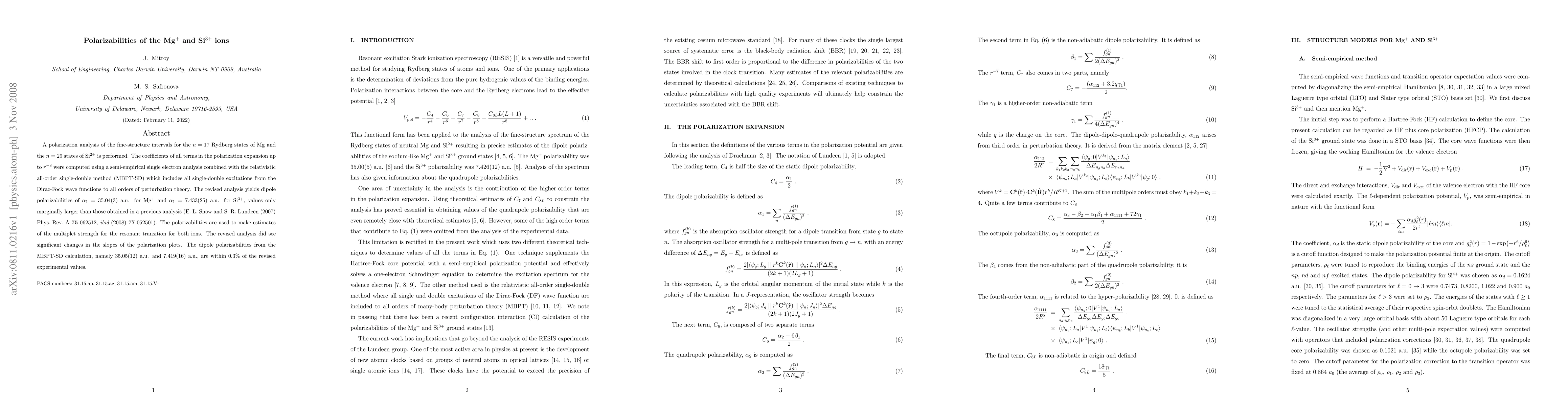 A polarization analysis of the fine-structure intervals for the $n = 17$ Rydberg states of Mg and the $n = 29$ states of Si$^{2+}$ is performed. The coefficients of all terms in the polarization expansion up to $r^{-8}$ were computed using a semi-empirical single electron analysis combined with the relativistic all-order single-double method (MBPT-SD) which includes all single-double excitations from the Dirac-Fock wave functions to all orders of perturbation theory. The revised analysis yields dipole polarizabilities of $\alpha_1 = 35.04(3)$ a.u. for Mg$^+$ and $\alpha_1 = 7.433(25)$ a.u. for Si$^{3+}$, values only marginally larger than those obtained in a previous analysis (E. L. Snow and S. R. Lundeen (2007) Phys. Rev. A {\bf 75} 062512, {\em ibid} (2008) {\bf 77} 052501). The polarizabilities are used to make estimates of the multiplet strength for the resonant transition for both ions. The revised analysis did see significant changes in the slopes of the polarization plots. The dipole polarizabilities from the MBPT-SD calculation, namely 35.05(12) a.u. and 7.419(16) a.u., are within 0.3% of the revised experimental values.