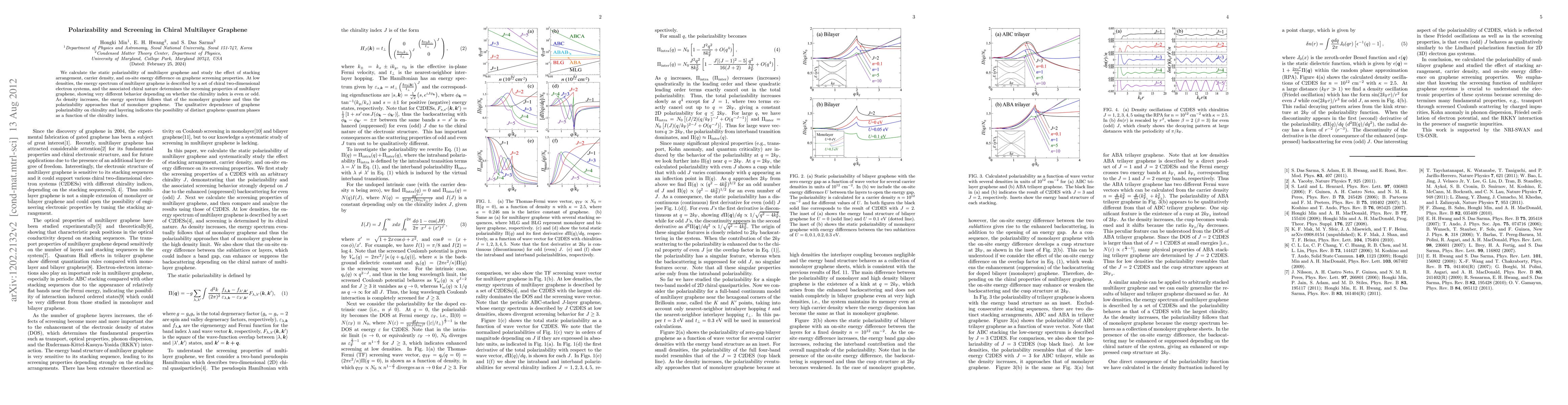 This paper investigates the static polarizability and screening properties of multilayer graphene, revealing distinct behaviors based on chirality and stacking arrangements. The study shows that at low densities, chirality significantly affects screening, with notable differences when the chirality index is even or odd, while higher densities lead to behavior resembling monolayer graphene.