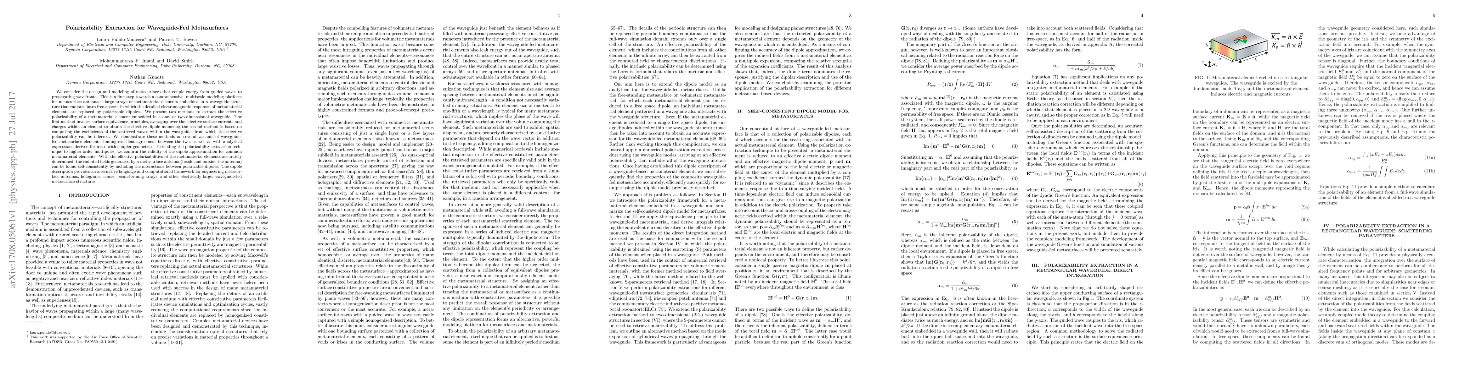 We consider the design and modeling of metasurfaces that couple energy from guided waves to propagating wavefronts. This is a first step towards a comprehensive, multiscale modeling platform for metasurface antennas-large arrays of metamaterial elements embedded in a waveguide structure that radiates into free-space--in which the detailed electromagnetic responses of metamaterial elements are replaced by polarizable dipoles. We present two methods to extract the effective polarizability of a metamaterial element embedded in a one- or two-dimensional waveguide. The first method invokes surface equivalence principles, averaging over the effective surface currents and charges within an element to obtain the effective dipole moments; the second method is based on computing the coefficients of the scattered waves within the waveguide, from which the effective polarizability can be inferred. We demonstrate these methods on several variants of waveguide-fed metasurface elements, finding excellent agreement between the two, as well as with analytical expressions derived for irises with simpler geometries. Extending the polarizability extraction technique to higher order multipoles, we confirm the validity of the dipole approximation for common metamaterial elements. With the effective polarizabilities of the metamaterial elements accurately determined, the radiated fields generated by a metasurface antenna (inside and outside the antenna) can be found self-consistently by including the interactions between polarizable dipoles. The dipole description provides an alternative language and computational framework for engineering metasurface antennas, holograms, lenses, beam-forming arrays, and other electrically large, waveguide-fed metasurface structures.