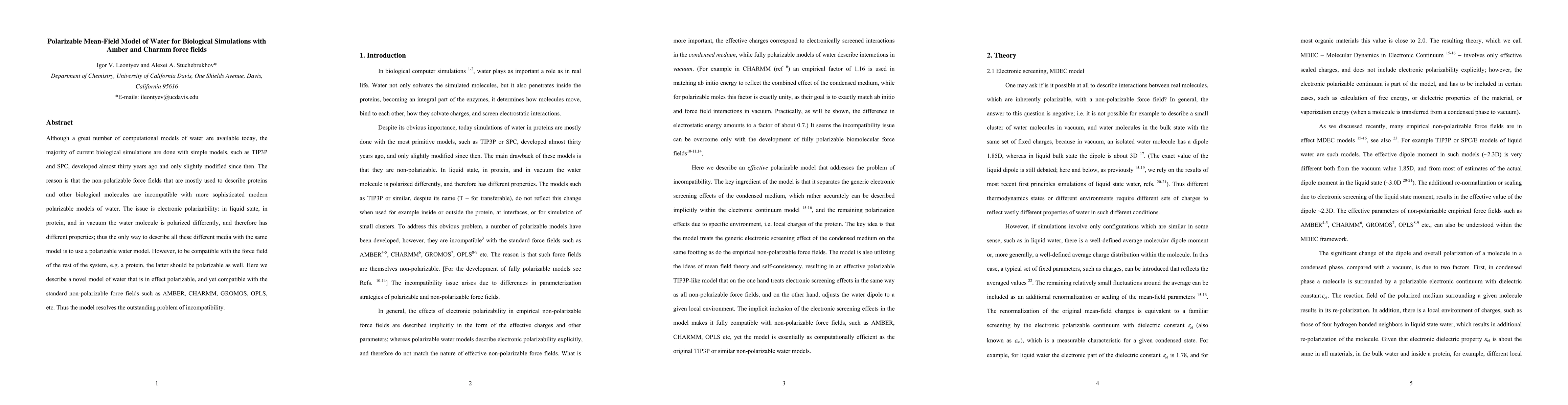 This paper introduces a novel polarizable mean-field model of water that maintains compatibility with existing non-polarizable force fields like AMBER and CHARMM, addressing the longstanding issue of integrating sophisticated polarizable water models into biological simulations. The proposed model aims to resolve the incompatibility between advanced water models and traditional force fields used for proteins and other biological molecules.
