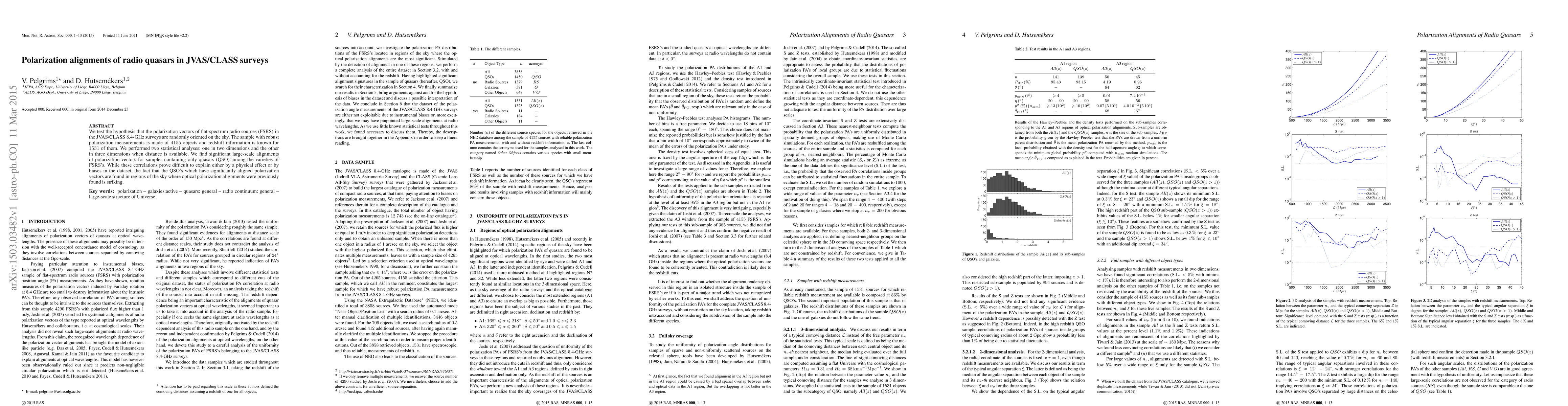 We test the hypothesis that the polarization vectors of flat-spectrum radio sources (FSRS) in the JVAS/CLASS 8.4-GHz surveys are randomly oriented on the sky. The sample with robust polarization measurements is made of $4155$ objects and redshift information is known for $1531$ of them. We performed two statistical analyses: one in two dimensions and the other in three dimensions when distance is available. We find significant large-scale alignments of polarization vectors for samples containing only quasars (QSO) among the varieties of FSRS's. While these correlations prove difficult to explain either by a physical effect or by biases in the dataset, the fact that the QSO's which have significantly aligned polarization vectors are found in regions of the sky where optical polarization alignments were previously found is striking.