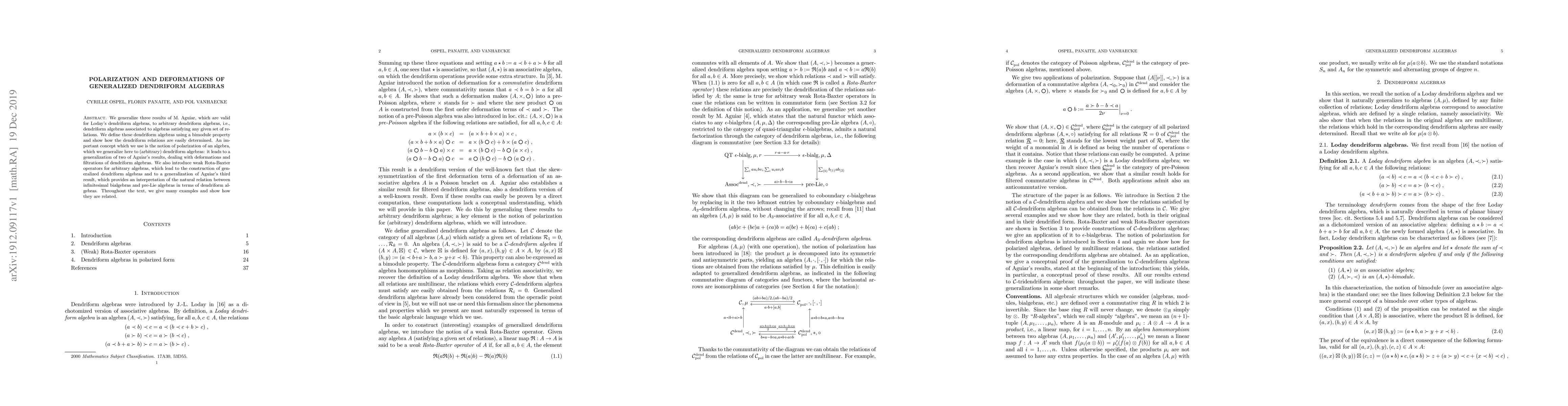 This paper generalizes results from M. Aguiar's work on Loday's dendriform algebras to arbitrary dendriform algebras using polarization and weak Rota-Baxter operators. It introduces generalized dendriform relations, deformations, and filtrations, and provides examples to illustrate the concepts.