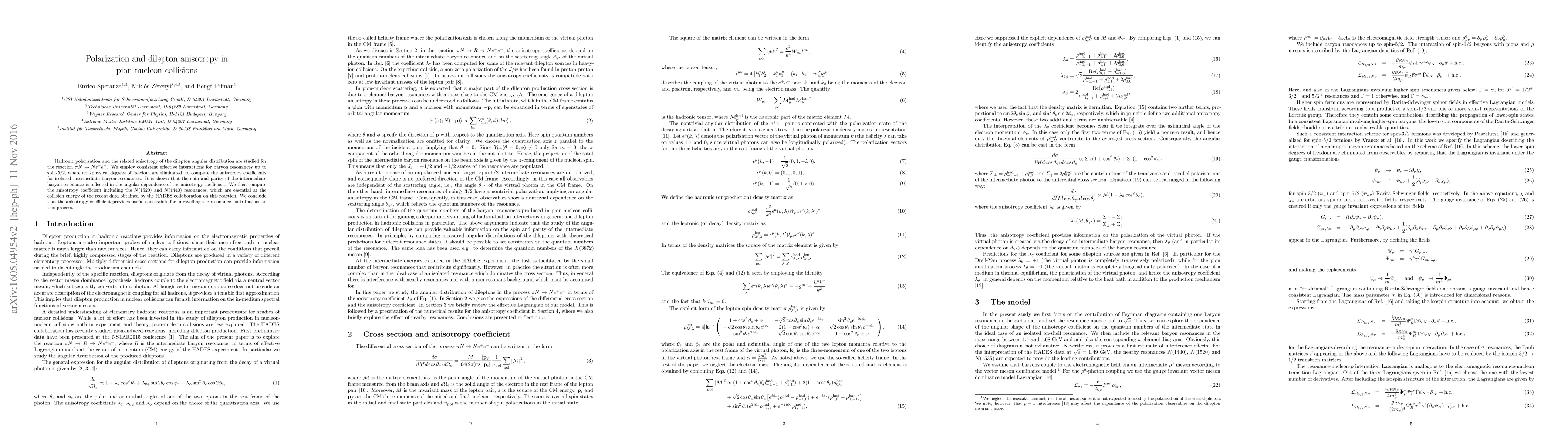 Hadronic polarization and the related anisotropy of the dilepton angular distribution are studied for the reaction $\pi N \rightarrow Ne^+ e^-$. We employ consistent effective interactions for baryon resonances up to spin-5/2, where non-physical degrees of freedom are eliminated, to compute the anisotropy coefficients for isolated intermediate baryon resonances. It is shown that the spin and parity of the intermediate baryon resonance is reflected in the angular dependence of the anisotropy coefficient. We then compute the anisotropy coefficient including the $N(1520)$ and $N(1440)$ resonances, which are essential at the collision energy of the recent data obtained by the HADES collaboration on this reaction. We conclude that the anisotropy coefficient provides useful constraints for unravelling the resonance contributions to this process.