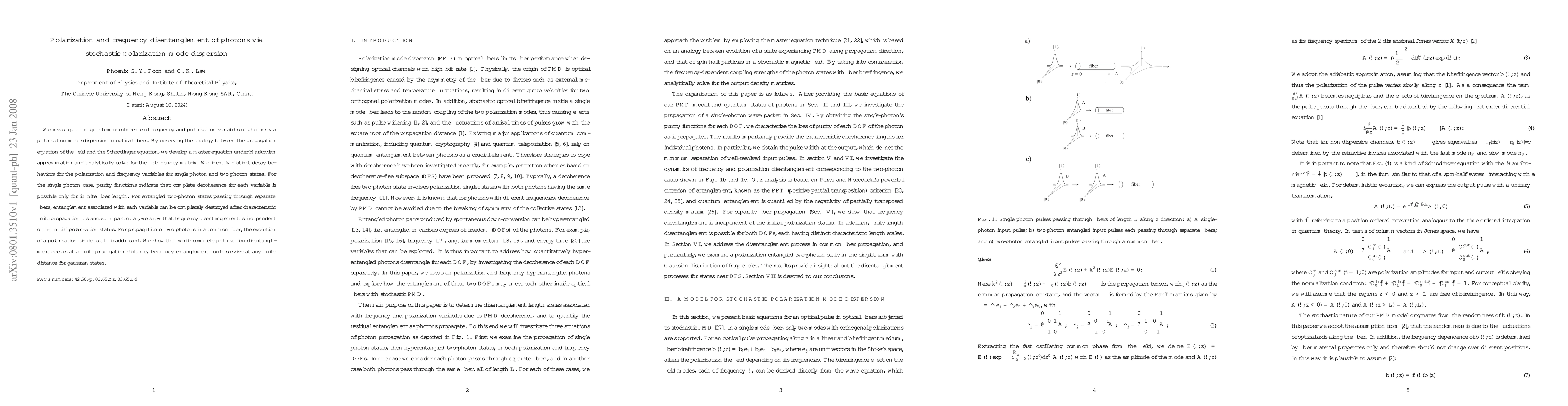 This paper explores the quantum decoherence of photon polarization and frequency via polarization mode dispersion in optical fibers, revealing distinct decay behaviors for single and entangled photon states. It finds that while complete polarization disentanglement can occur at finite distances, frequency entanglement in Gaussian states may persist indefinitely.