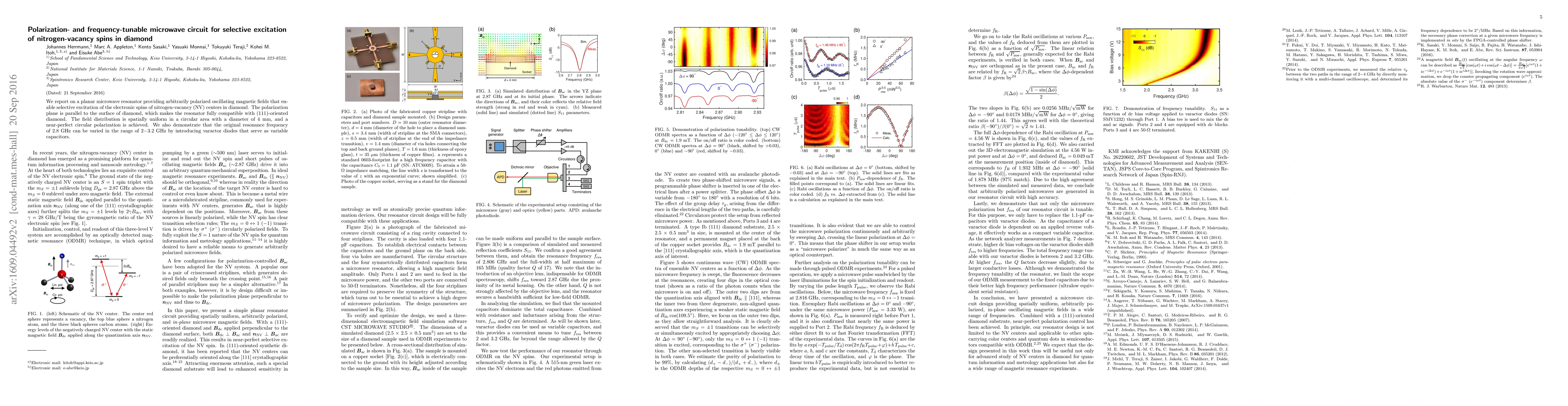 This paper presents a planar microwave resonator that generates tunable, polarized magnetic fields for selective excitation of nitrogen-vacancy spins in diamond. The resonator's frequency can be varied from 2 to 3.2 GHz using varactor diodes, enabling precise control over NV center excitation.