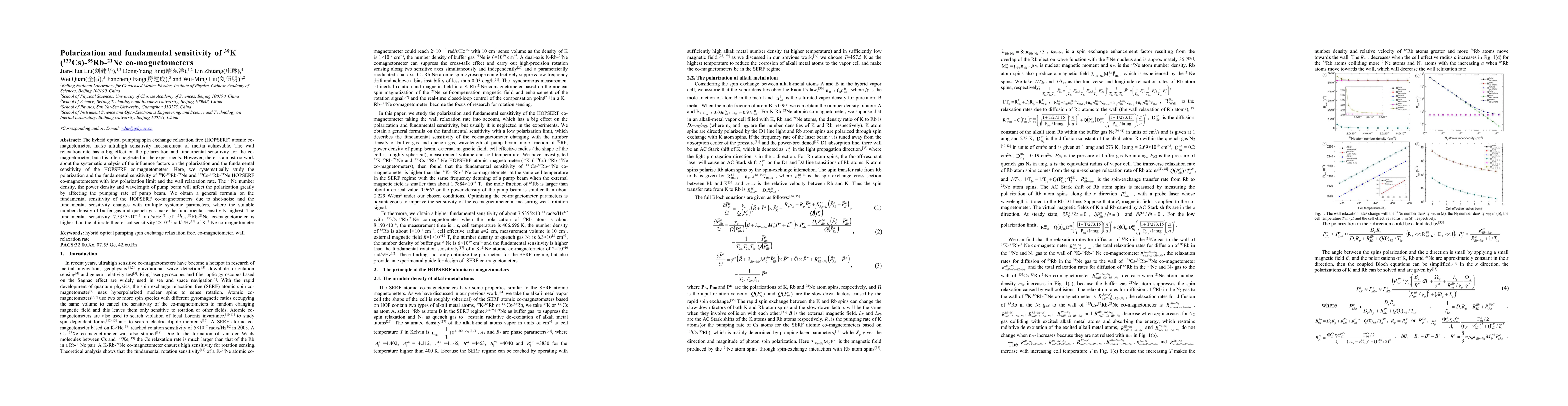 The hybrid optical pumping spin exchange relaxation free (HOPSERF) atomic co-magnetometers make ultrahigh sensitivity measurement of inertia achievable. The wall relaxation rate has a big effect on the polarization and fundamental sensitivity for the co-magnetometer, but it is often neglected in the experiments. However, there is almost no work about the systematic analysis of the influence factors on the polarization and the fundamental sensitivity of the HOPSERF co-magnetometers. Here, we systematically study the polarization and the fundamental sensitivity of 39K-85Rb-21Ne and 133Cs-85Rb-21Ne HOPSERF co-magnetometers with low polarization limit and the wall relaxation rate. The 21Ne number density, the power density and wavelength of pump beam will affect the polarization greatly by affecting the pumping rate of pump beam. We obtain a general formula on the fundamental sensitivity of the HOPSERF co-magnetometers due to shot-noise and the fundamental sensitivity changes with multiple systemic parameters, where the suitable number density of buffer gas and quench gas make the fundamental sensitivity highest. The fundamental sensitivity $7.5355\times10^{-11}$ $\rm rad/s/Hz^{1/2}$ of 133Cs-85Rb-21Ne co-magnetometer is higher than the ultimate theoretical sensitivity $2\times10^{-10}$ $\rm rad/s/Hz^{1/2}$ of K-21Ne co-magnetometer.