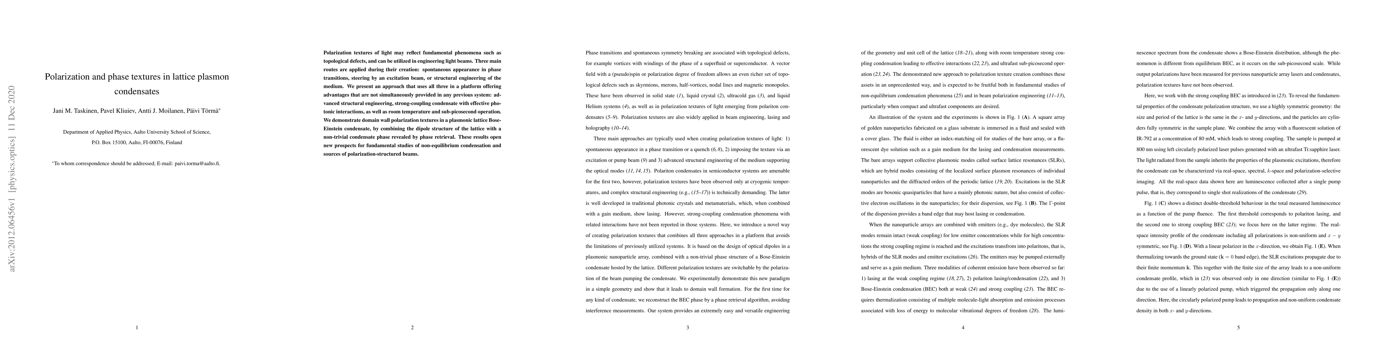 Polarization textures of light may reflect fundamental phenomena such as topological defects, and can be utilized in engineering light beams. Three main routes are applied during their creation: spontaneous appearance in phase transitions, steering by an excitation beam, or structural engineering of the medium. We present an approach that uses all three in a platform offering advantages that are not simultaneously provided in any previous system: advanced structural engineering, strong-coupling condensate with effective photonic interactions, as well as room temperature and sub-picosecond operation. We demonstrate domain wall polarization textures in a plasmonic lattice Bose-Einstein condensate, by combining the dipole structure of the lattice with a non-trivial condensate phase revealed by phase retrieval. These results open new prospects for fundamental studies of non-equilibrium condensation and sources of polarization-structured beams.