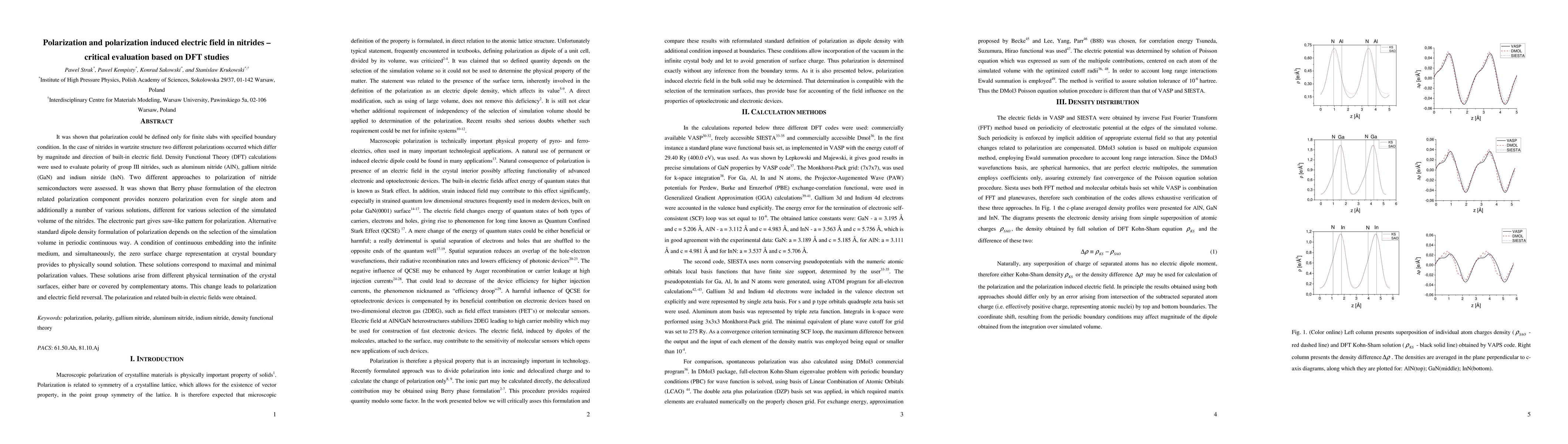 Density Functional Theory (DFT) calculations were used to evaluate polarity of group III nitrides, such as aluminum nitride (AlN), gallium nitride (GaN) and indium nitride (InN) providing physically sound quantitative measure of polarity of these materials. Two different approaches to polarization of nitride semiconductors were assessed and the conclusions have been used to develop models. It was shown that Berry phase formulation of the electron related polarization component provides a number of various solutions, different for various selection of the simulated volume. The electronic part gives saw-like pattern for polarization. A total number of these solutions, related to well known scaling of the geometric phase, is equal to the number of valence electrons in the system. Summation with similar pattern for ionic part provides several polarization values. Standard dipole density formulation depends on the selection of the simulation volume in periodic continuous way. Using a condition of continuous embedding into the infinite medium, and simultaneously, the zero surface charge representation at crystal boundary provides to physically sound solution. This solution is corresponding to maximal and minimal polarization values and also corresponds to different physical termination of the crystal surfaces, either bare or covered by complementary atoms. This change leads to polarization and electric field reversal. The polarization and related fields in finite size systems were obtained.