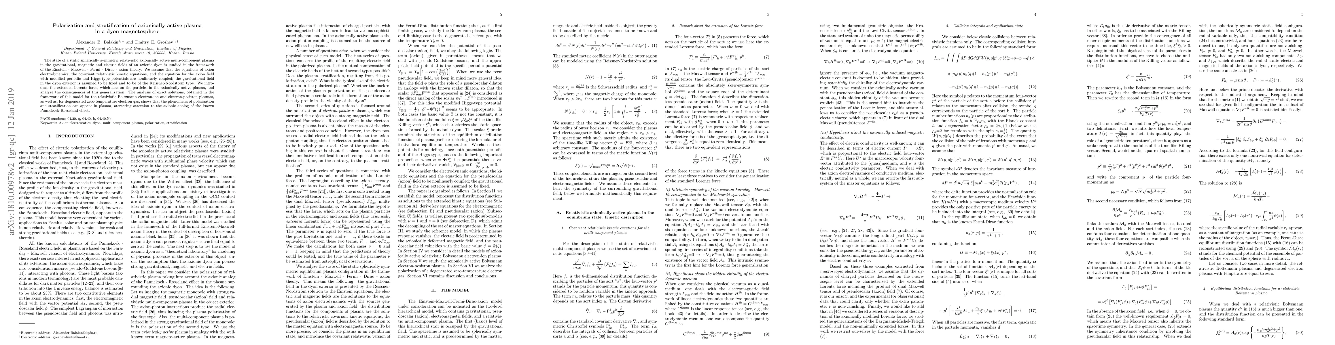 The state of a static spherically symmetric relativistic axionically active multi-component plasma in the gravitational, magnetic and electric fields of an axionic dyon is studied in the framework of the Einstein - Maxwell - Boltzmann - axion theory. We assume that the equations of axion electrodynamics, the covariant relativistic kinetic equations, and the equation for the axion field with modified Higgs-type potential are nonlinearly coupled; the gravitational field in the dyon exterior is assumed to be fixed and to be of the Reissner-Nordstr\"om type. We introduce the extended Lorentz force, which acts on the particles in the axionically active plasma, and analyze the consequences of this generalization. The analysis of exact solutions, obtained in the framework of this model for the relativistic Boltzmann electron-ion and electron-positron plasmas, as well as, for degenerated zero-temperature electron gas, shows that the phenomena of polarization and stratification can appear in plasma, attracting attention to the axionic analog of the known Pannekoek-Rosseland effect.
