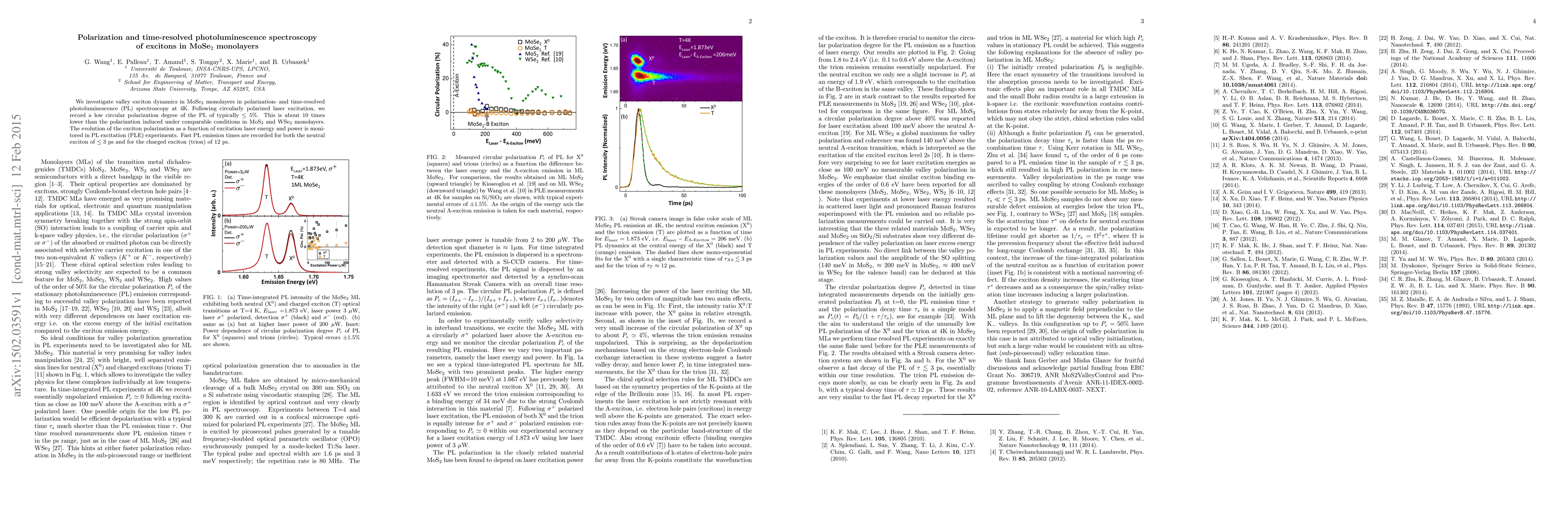 This study uses polarization- and time-resolved photoluminescence spectroscopy to examine valley exciton dynamics in MoSe2 monolayers at 4K, finding a low circular polarization degree of PL ($\leq5\%$), significantly lower than in MoS2 and WSe2. Fast PL emission times of $\leq3$ ps for neutral excitons and 12 ps for charged excitons are recorded.