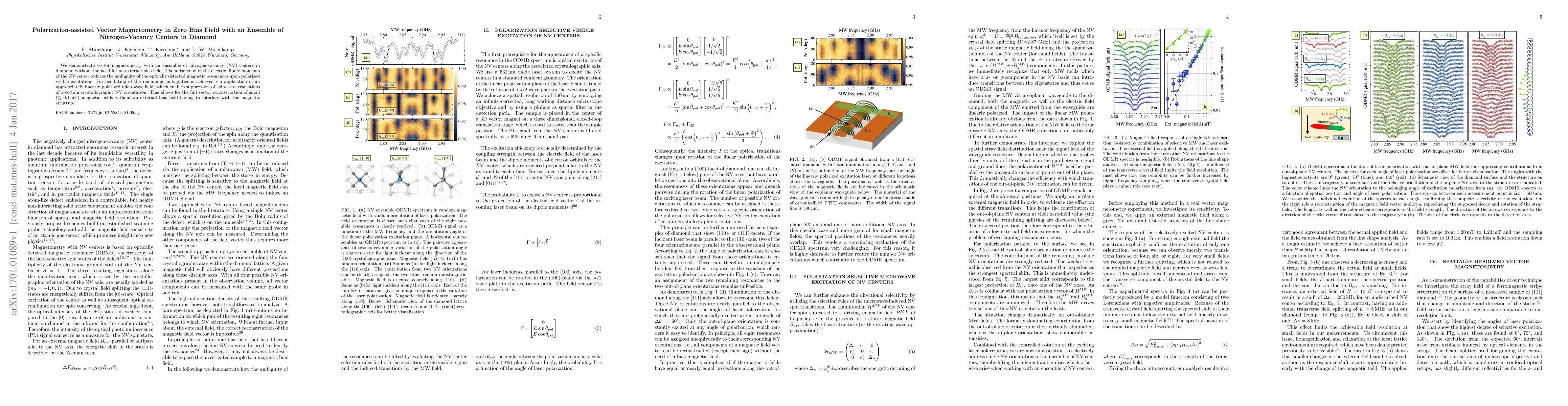 This paper presents a method for vector magnetometry using an ensemble of nitrogen-vacancy centers in diamond without an external bias field, utilizing polarized visible excitation and microwave fields to resolve magnetic field ambiguities and reconstruct small magnetic fields accurately.