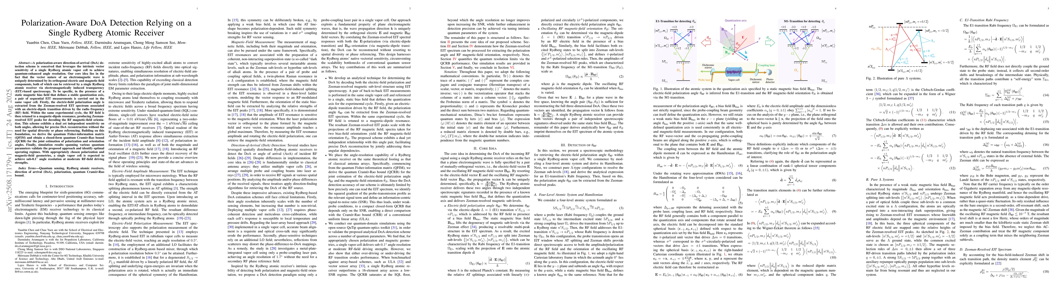 A polarization-aware direction-of-arrival (DoA) detection scheme is conceived that leverages the intrinsic vector sensitivity of a single Rydberg atomic vapor cell to achieve quantum-enhanced angle resolution. Our core idea lies in the fact that the vector nature of an electromagnetic wave is uniquely determined by its orthogonal electric and magnetic field components, both of which can be retrieved by a single Rydberg atomic receiver via electromagnetically induced transparency (EIT)-based spectroscopy. To be specific, in the presence of a static magnetic bias field that defines a stable quantization axis, a pair of sequential EIT measurements is carried out in the same vapor cell. Firstly, the electric-field polarization angle is extracted from the Zeeman-resolved EIT spectrum associated with an electric-dipole transition driven by the radio frequency (RF) field. Within the same experimental cycle, the RF field is then retuned to a magnetic-dipole resonance, producing Zeeman-resolved EIT peaks for decoding the RF magnetic-field orientation. This scheme exhibits a dual yet independent sensitivity on both angles, allowing for precise DoA reconstruction without the need for spatial diversity or phase referencing. Building on this foundation, we derive the quantum Fisher-information matrix (QFIM) and obtain a closed-form quantum Cram\'{e}r-Rao bound (QCRB) for the joint estimation of polarization and orientation angles. Finally, simulation results spanning various quantum parameters validate the proposed approach and identify optimal operating regimes. With appropriately chosen polarization and magnetic-field geometries, a single vapor cell is expected to achieve sub-0.1$^\circ$ angle resolution at moderate RF-field driving strengths.