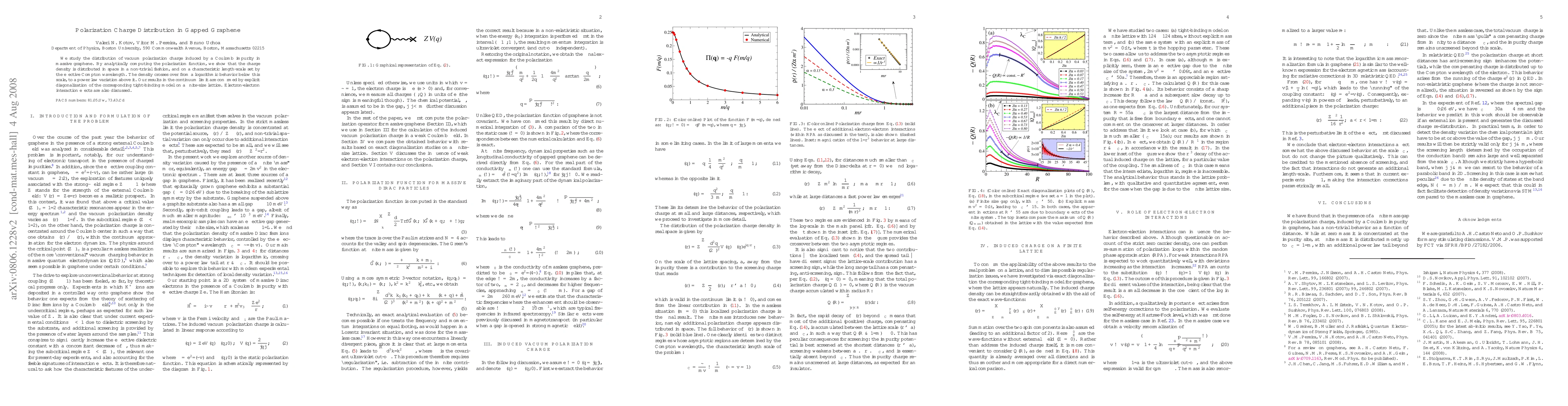We study the distribution of vacuum polarization charge induced by a Coulomb impurity in massive graphene. By analytically computing the polarization function, we show that the charge density is distributed in space in a non-trivial fashion, and on a characteristic length-scale set by the effective Compton wavelength. The density crosses over from a logarithmic behavior below this scale, to a power law variation above it. Our results in the continuum limit are confirmed by explicit diagonalization of the corresponding tight-binding model on a finite-size lattice. Electron-electron interaction effects are also discussed.