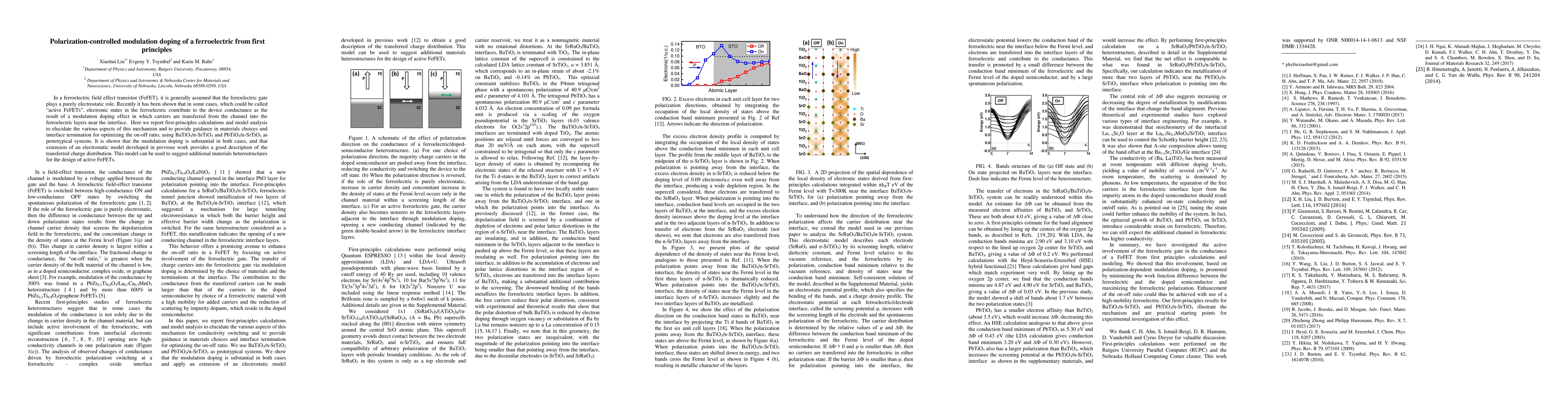 This paper uses first-principles calculations to investigate modulation doping in ferroelectric field effect transistors (FeFETs), demonstrating that electronic states in ferroelectrics can contribute to device conductance. The study suggests that optimization of materials and interface termination can enhance the on-off ratio in active FeFETs, using BaTiO3/n-SrTiO3 and PbTiO3/n-SrTiO3 as examples.