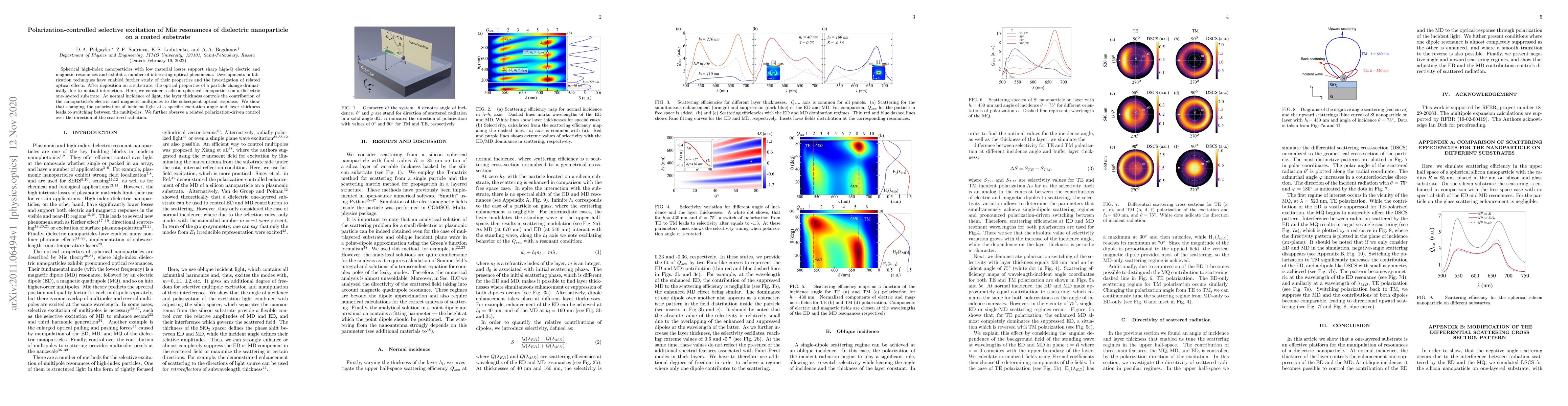 High-index spherical nanoparticles with low material losses support sharp high-Q electric and magnetic resonances and exhibit a number of interesting optical phenomena. Developments in fabrication techniques have enabled the further study of their properties and the investigation of related optical effects. After deposition on a substrate, the optical properties of a particle change dramatically due to mutual interaction. Here, we consider a silicon spherical nanoparticle on a dielectric one-layered substrate. At the normal incidence of light, the layer thickness controls the contribution of the nanoparticle's electric and magnetic multipoles to the subsequent optical response. We show that changing the polarization of incident light at a specific excitation angle and layer thickness leads to switching between the multipoles. We further observe a related polarization-driven control over the direction of the scattered radiation.