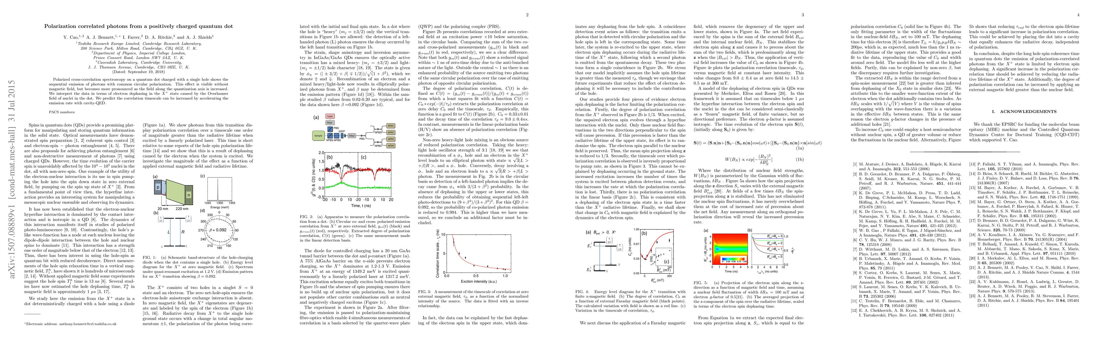 Polarized cross-correlation spectroscopy on a quantum dot charged with a single hole shows the sequential emission of photons with common circular polarization. This effect is visible without magnetic field, but becomes more pronounced as the field along the quantization axis is increased. We interpret the data in terms of electron dephasing in the X+ state caused by the Overhauser field of nuclei in the dot. We predict the correlation timescale can be increased by accelerating the emission rate with cavity-QED.