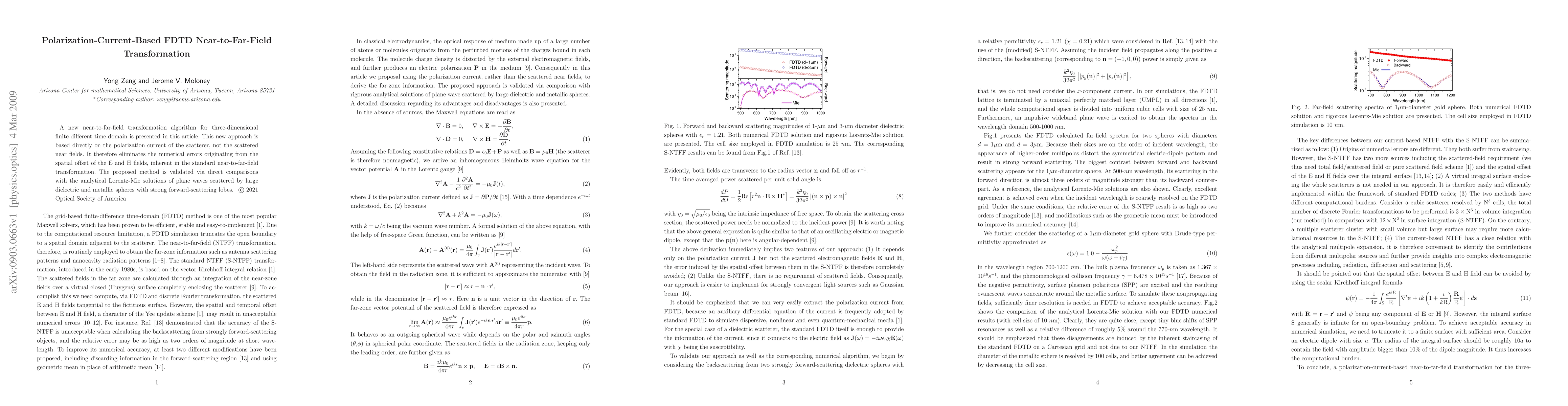 A new near-to-far-field transformation algorithm for three-dimensional finite-different time-domain is presented in this article. This new approach is based directly on the polarization current of the scatterer, not the scattered near fields. It therefore eliminates the numerical errors originating from the spatial offset of the E and H fields, inherent in the standard near-to-far-field transformation. The proposed method is validated via direct comparisons with the analytical Lorentz-Mie solutions of plane waves scattered by large dielectric and metallic spheres with strong forward-scattering lobes.