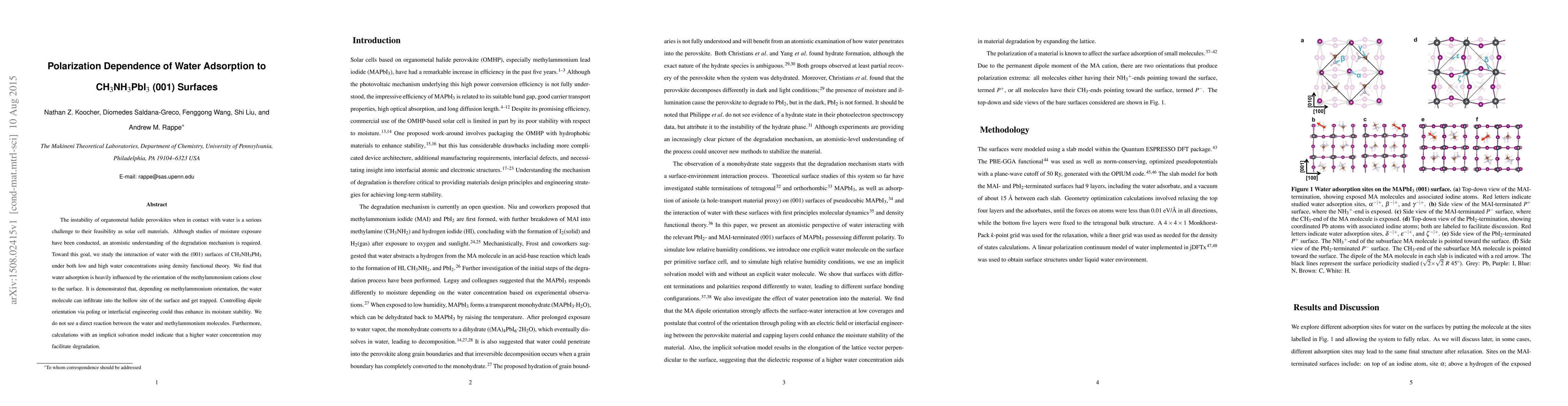The instability of organometal halide perovskites when in contact with water is a serious challenge to their feasibility as solar cell materials. Although studies of moisture exposure have been conducted, an atomistic understanding of the degradation mechanism is required. Toward this goal, we study the interaction of water with the (001) surfaces of CH$_3$NH$_3$PbI$_3$ under both low and high water concentrations using density functional theory. We find that water adsorption is heavily influenced by the orientation of the methylammonium cations close to the surface. It is demonstrated that, depending on methylammonium orientation, the water molecule can infiltrate into the hollow site of the surface and get trapped. Controlling dipole orientation via poling or interfacial engineering could thus enhance its moisture stability. We do not see a direct reaction between the water and methylammonium molecules. Furthermore, calculations with an implicit solvation model indicate that a higher water concentration may facilitate degradation.