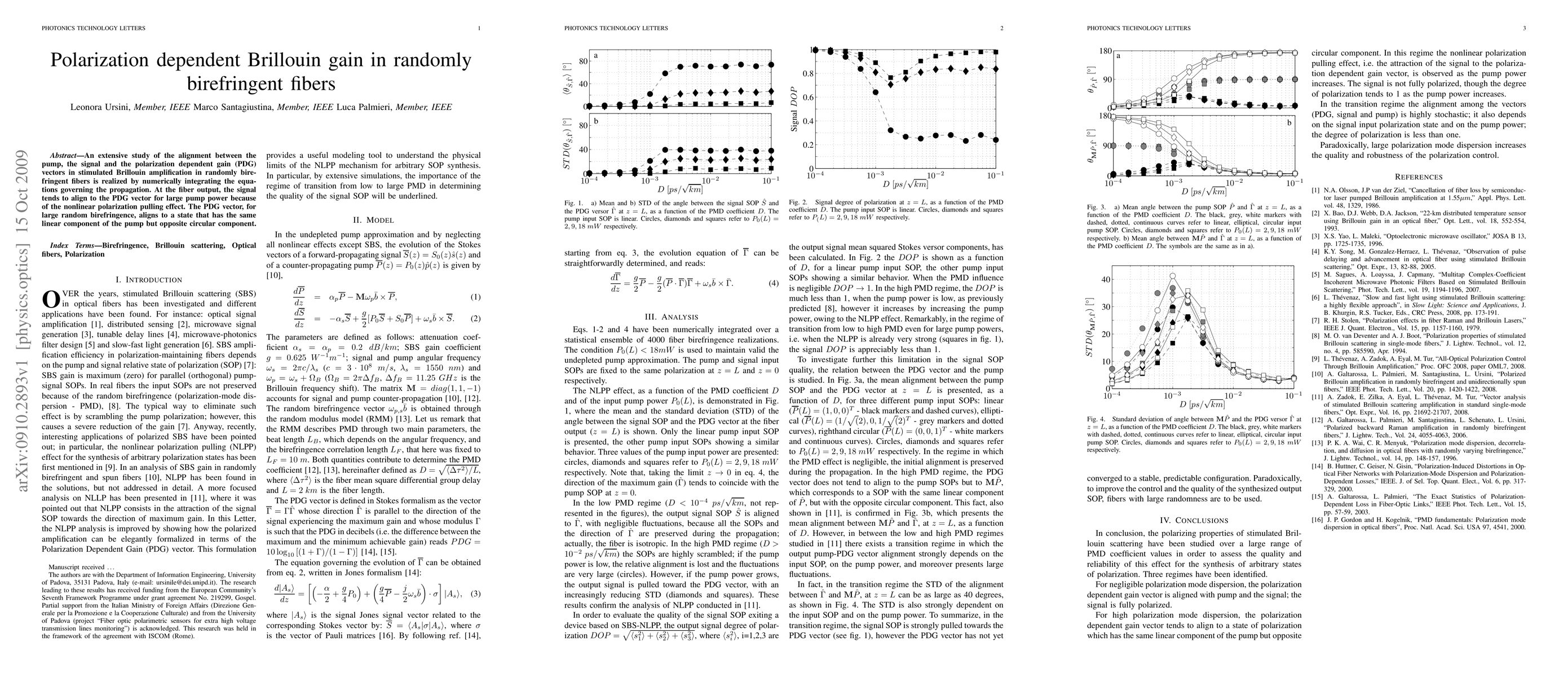 An extensive study of the alignment between the pump, the signal and the polarization dependent gain (PDG) vectors in stimulated Brillouin amplification in randomly birefringent fibers is realized by numerically integrating the equations governing the propagation. At the fiber output, the signal tends to align to the PDG vector for large pump power because of the nonlinear polarization pulling effect. The PDG vector, for large random birefringence, aligns to a state that has the same linear component of the pump but opposite circular component.