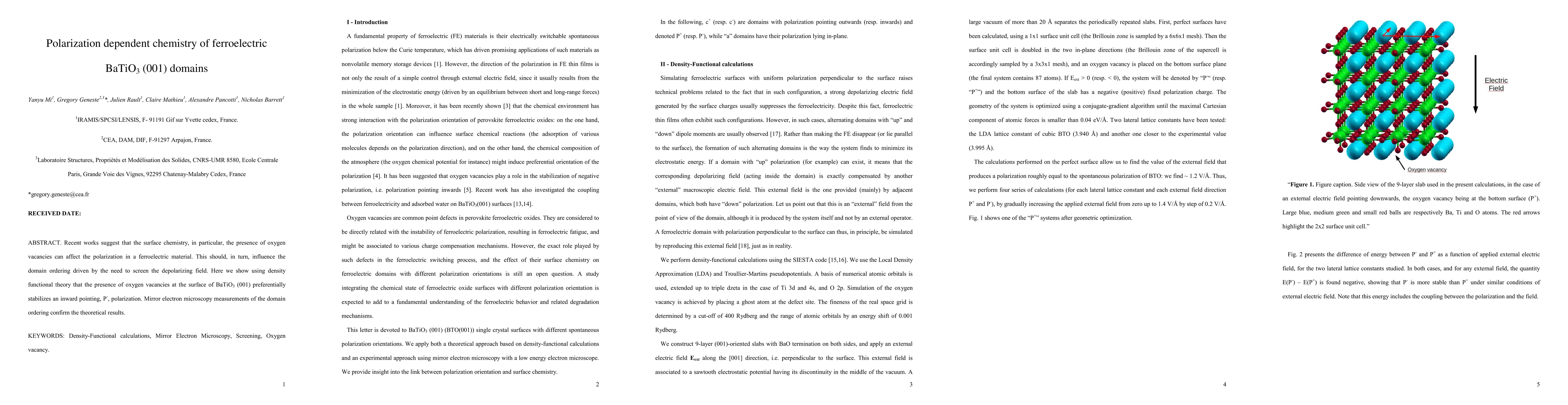 Recent works suggest that the surface chemistry, in particular, the presence of oxygen vacancies can affect the polarization in a ferroelectric material. This should, in turn, influence the domain ordering driven by the need to screen the depolarizing field. Here we show using density functional theory that the presence of oxygen vacancies at the surface of BaTiO3 (001) preferentially stabilizes an inward pointing, P-, polarization. Mirror electron microscopy measurements of the domain ordering confirm the theoretical results.