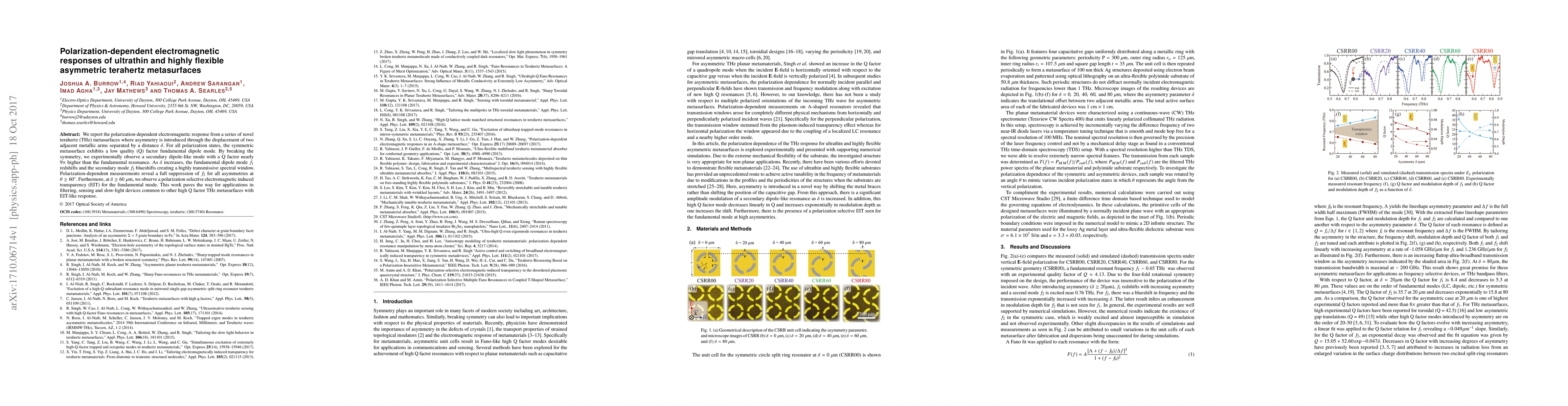 This paper investigates asymmetric terahertz metasurfaces that exhibit enhanced polarization-dependent electromagnetic responses. By introducing asymmetry through the displacement of metallic arms, a secondary high-Q factor dipole mode is observed, leading to a tunable spectral window and polarization-selective electromagnetic induced transparency.
