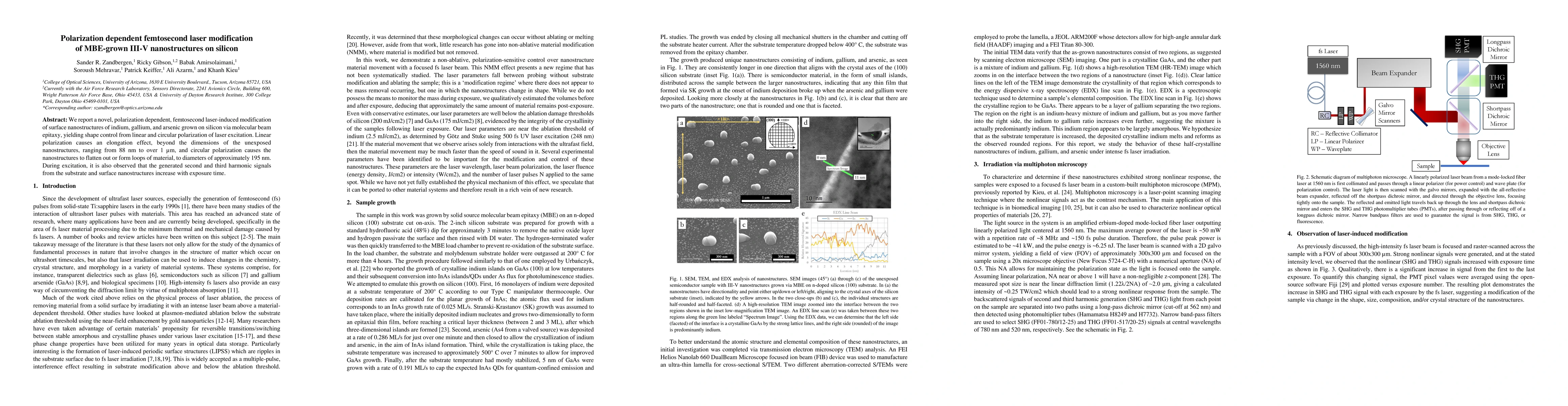 This paper details a femtosecond laser technique that modifies III-V nanostructures on silicon, revealing polarization-dependent shape changes: linear polarization elongates structures, while circular polarization flattens or loops them. The process also increases second and third harmonic signals over time.