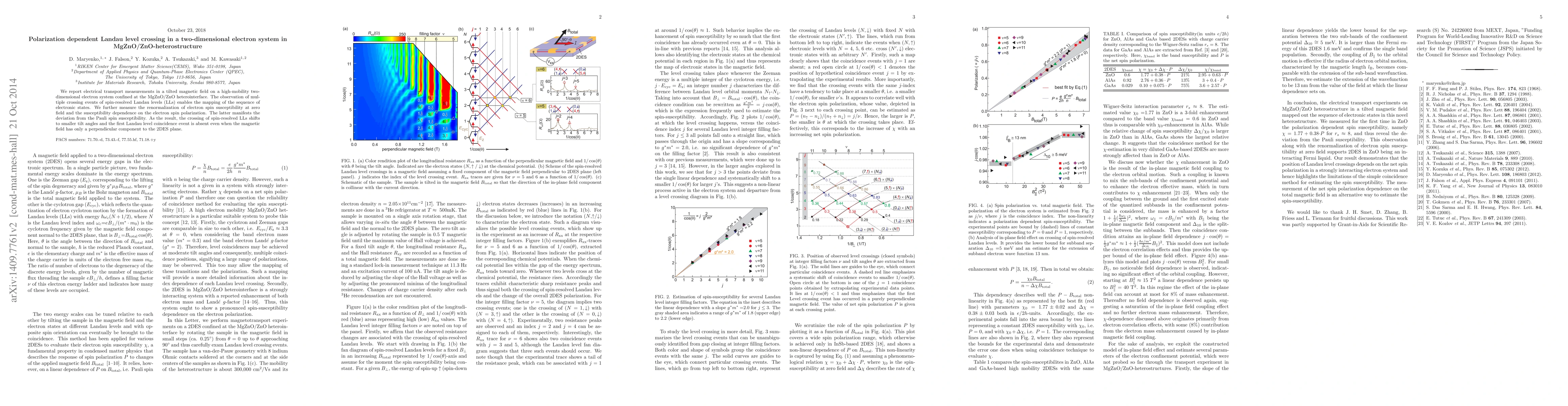 This study investigates the polarization-dependent Landau level crossings in a high-mobility two-dimensional electron system in a MgZnO/ZnO heterostructure under tilted magnetic fields. The research reveals multiple spin-resolved Landau level crossings and demonstrates a deviation from Pauli spin susceptibility, resulting in shifts in the crossing angles and absence of the first Landau level coincidence event.