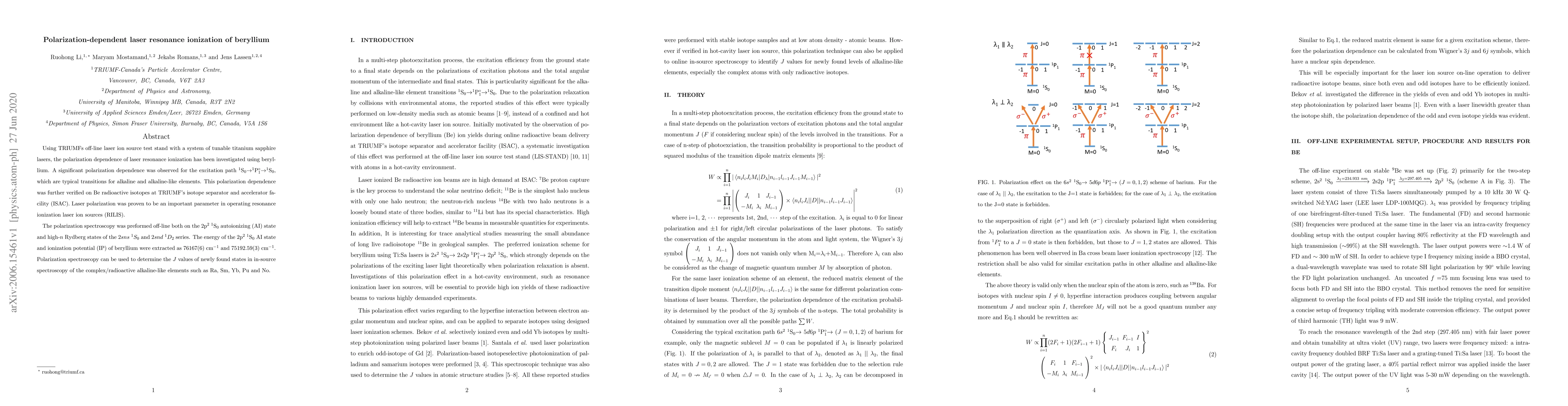 Using TRIUMF's off-line laser ion source test stand with a system of tunable titanium sapphire lasers, the polarization dependence of laser resonance ionization has been investigated using beryllium. A significant polarization dependence was observed for the excitation path $^1$S$_0$$\rightarrow$$^1$P$^{\circ}_1$$\rightarrow$$^1$S$_0$, which are typical transitions for alkaline and alkaline-like elements. This polarization dependence was further verified on Be radioactive isotopes at TRIUMF's isotope separator and accelerator facility (ISAC). Laser polarization was proven to be an important parameter in operating resonance ionization laser ion sources (RILIS). The polarization spectroscopy was preformed off-line both on the 2p$^2$ $^1$S$_0$ autoionizing (AI) state and high-$n$ Rydberg states of the $2sns$ $^1S_0$ and $2snd$ $^1D_2$ series. The energy of the 2p$^2$ $^1$S$_0$ AI state and ionization potential (IP) of beryllium were extracted as 76167(6)~cm$^{-1}$ and 75192.59(3)~cm$^{-1}$. Polarization spectroscopy can be used to determine the $J$ values of newly found states in in-source spectroscopy of the complex/radioactive alkaline-like elements such as Ra, Sm, Yb, Pu and No.