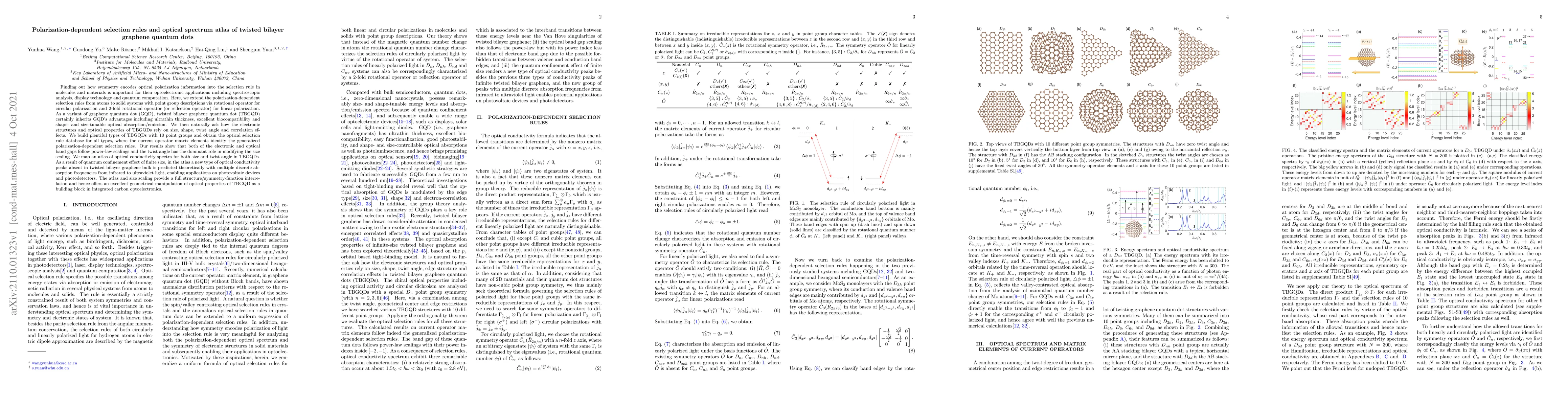 Finding out how symmetry encodes optical polarization information into the selection rule in molecules and materials is important for their optoelectronic applications including spectroscopic analysis, display technology and quantum computation. Here, we extend the polarization-dependent selection rules from atoms to solid systems with point group descriptions via rotational operator for circular polarization and $2$-fold rotational operator (or reflection operator) for linear polarization. As a variant of graphene quantum dot (GQD), twisted bilayer graphene quantum dot (TBGQD) certainly inherits GQD's advantages including ultrathin thickness, excellent biocompatibility and shape- and size-tunable optical absorption/emission. We then naturally ask how the electronic structures and optical properties of TBGQDs rely on size, shape, twist angle and correlation effects. We build plentiful types of TBGQDs with $10$ point groups and obtain the optical selection rule database for all types, where the current operator matrix elements identify the generalized polarization-dependent selection rules. Our results show that both of the electronic and optical band gaps follow power-law scalings and the twist angle has the dominant role in modifying the size scaling. We map an atlas of optical conductivity spectra for both size and twist angle in TBGQDs. As a result of quantum confinement effect of finite size, in the atlas a new type of optical conductivity peaks absent in twisted bilayer graphene bulk is predicted theoretically with multiple discrete absorption frequencies from infrared to ultraviolet light, enabling applications on photovoltaic devices and photodetectors. The atlas and size scaling provide a full structure/symmetry-function interrelation and hence offers an excellent geometrical manipulation of optical properties of TBGQD as a building block in integrated carbon optoelectronics.