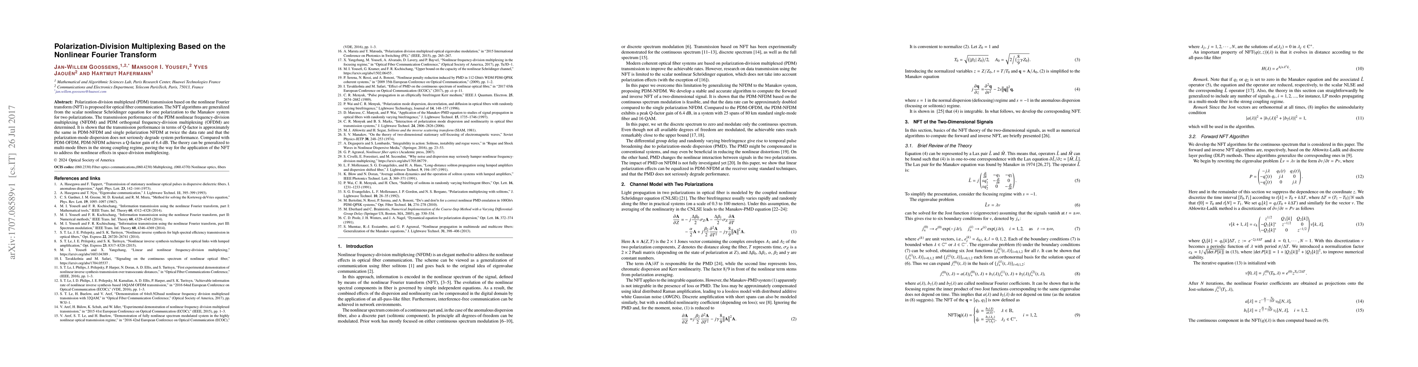 This paper proposes a polarization-division multiplexing technique based on the nonlinear Fourier transform (NFT) for optical fiber communication, showing comparable performance to single polarization systems at double the data rate. PDM-NFDM achieves a Q-factor gain of 6.4 dB over PDM-OFDM, indicating better performance despite polarization-mode dispersion.