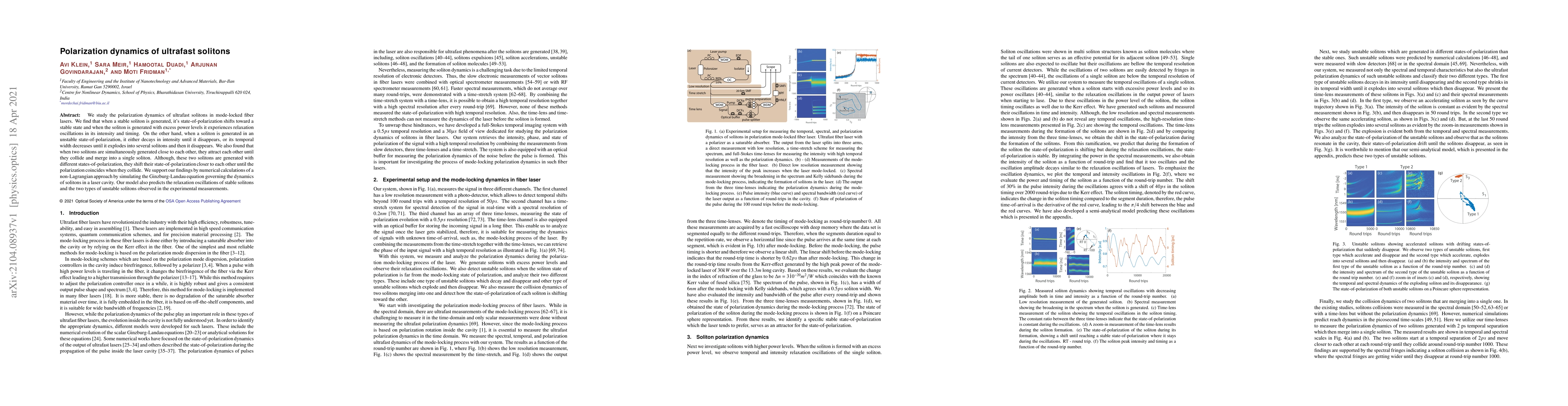 We study the polarization dynamics of ultrafast solitons in mode-locked fiber lasers. We find that when a stable soliton is generated, it's state-of-polarization shifts toward a stable state and when the soliton is generated with excess power levels it experiences relaxation oscillations in its intensity and timing. On the other hand, when a soliton is generated in an unstable state-of-polarization, it either decays in intensity until it disappears, or its temporal width decreases until it explodes into several solitons and then it disappears. We also found that when two solitons are simultaneously generated close to each other, they attract each other until they collide and merge into a single soliton. Although, these two solitons are generated with different states-of-polarization, they shift their state-of-polarization closer to each other until the polarization coincides when they collide. We support our findings by numerical calculations of a non-Lagrangian approach by simulating the Ginzburg-Landau equation governing the dynamics of solitons in a laser cavity. Our model also predicts the relaxation oscillations of stable solitons and the two types of unstable solitons observed in the experimental measurements.