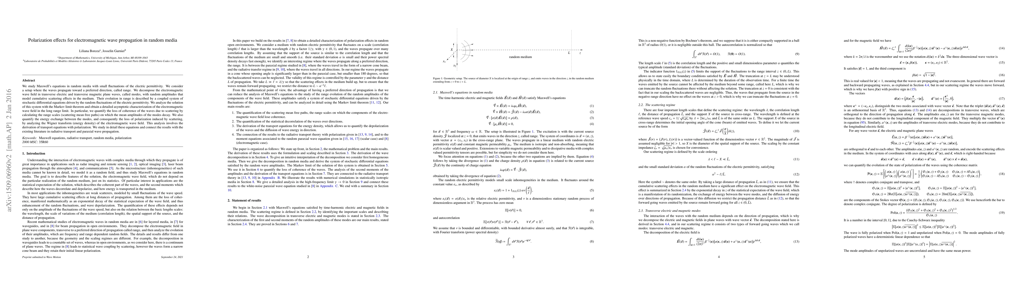 This paper investigates the polarization effects of electromagnetic waves propagating through random media, modeling the wave field as a system of stochastic differential equations. The study quantifies coherence loss and polarization degradation due to scattering, deriving transport equations and connecting findings to radiative transport and paraxial wave propagation theories.