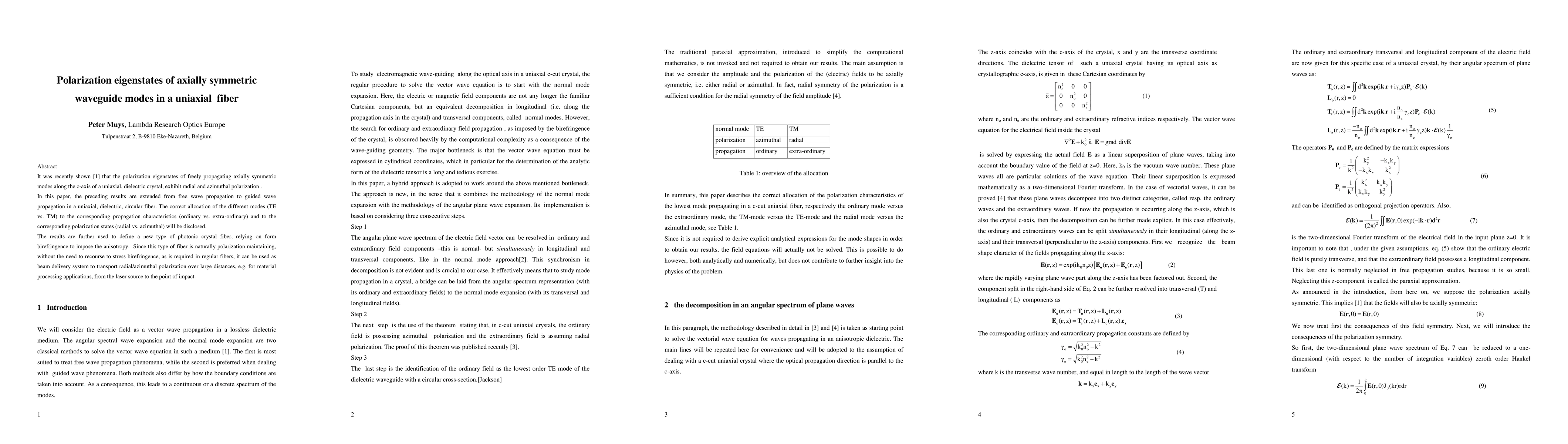 Summary: This paper identifies the polarization eigenstates of axially symmetric waveguide modes in a round uniaxial fiber as radial and azimuthal. The study provides a detailed analysis of how these modes behave within the fiber.