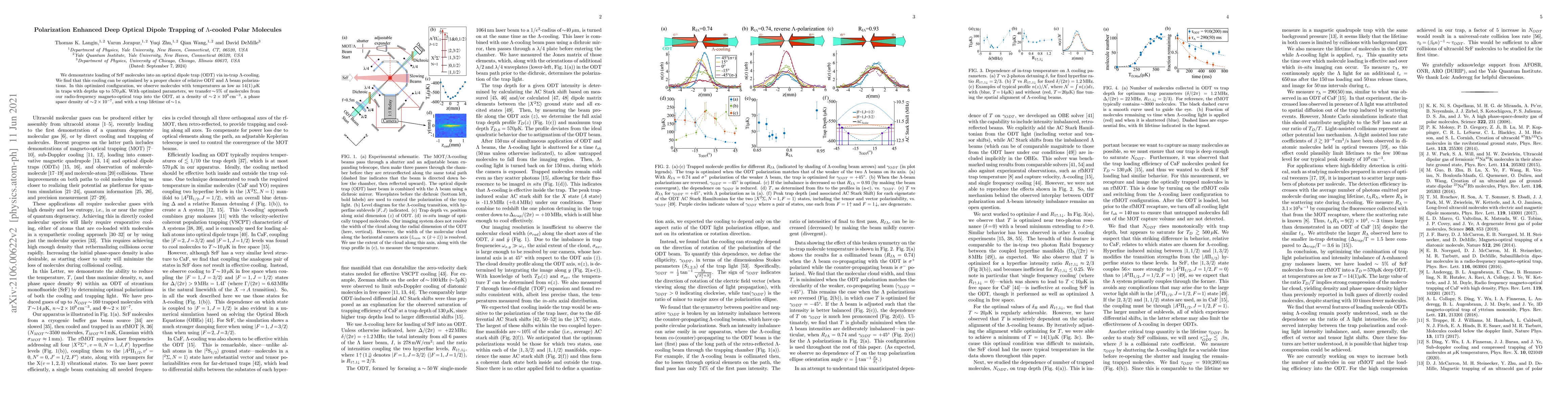 We demonstrate loading of SrF molecules into an optical dipole trap (ODT) via in-trap $\Lambda$-cooling. We find that this cooling can be optimized by a proper choice of relative ODT and $\Lambda$ beam polarizations. In this optimized configuration, we observe molecules with temperatures as low as 14(1) $\mu$K in traps with depths up to 570 $\mu$K. With optimized parameters, we transfer $\!\sim\!5$% of molecules from our radio-frequency magneto-optical trap into the ODT, at a density of $\sim\!2\times 10^{9}$ cm$^{-3}$, a phase space density of $\sim\!2\times 10^{-7}$, and with a trap lifetime of $\!\sim\!1$ s.