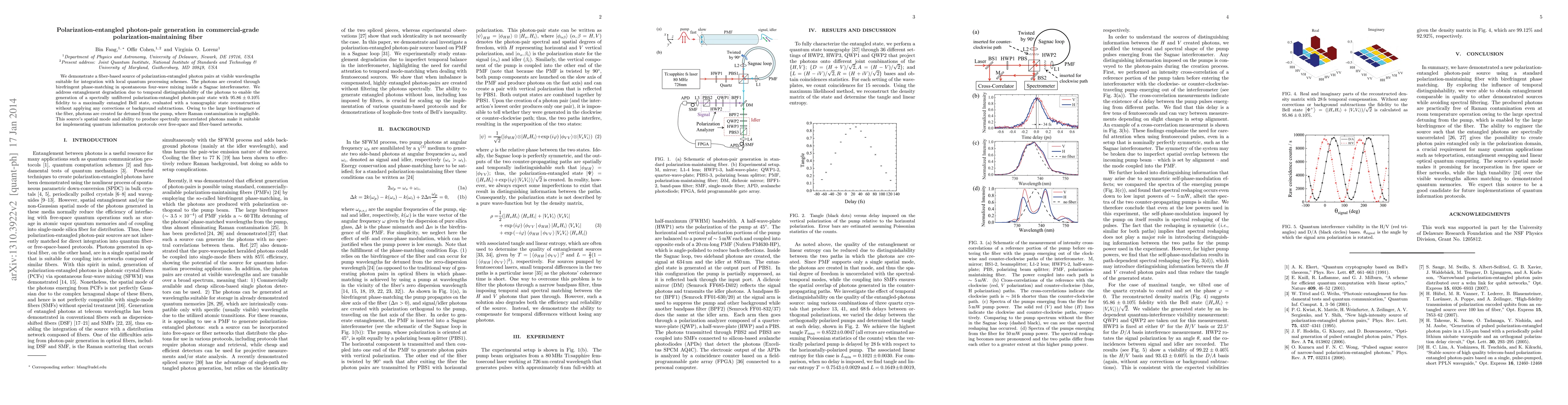 We demonstrate a fiber-based source of polarization-entangled photon pairs at visible wavelengths suitable for integration with local quantum processing schemes. The photons are created through birefringent phase-matching in spontaneous four-wave mixing inside a Sagnac interferometer. We address entanglement degradation due to temporal distinguishability of the photons to enable the generation of a spectrally unfiltered polarization-entangled photon-pair state with $95.86\pm0.10%$ fidelity to a maximally entangled Bell state, evaluated with a tomographic state reconstruction without applying any corrections or background subtractions. Owing to the large birefringence of the fiber, photons are created far detuned from the pump, where Raman contamination is negligible. This source's spatial mode and ability to produce spectrally uncorrelated photons make it suitable for implementing quantum information protocols over free-space and fiber-based networks.